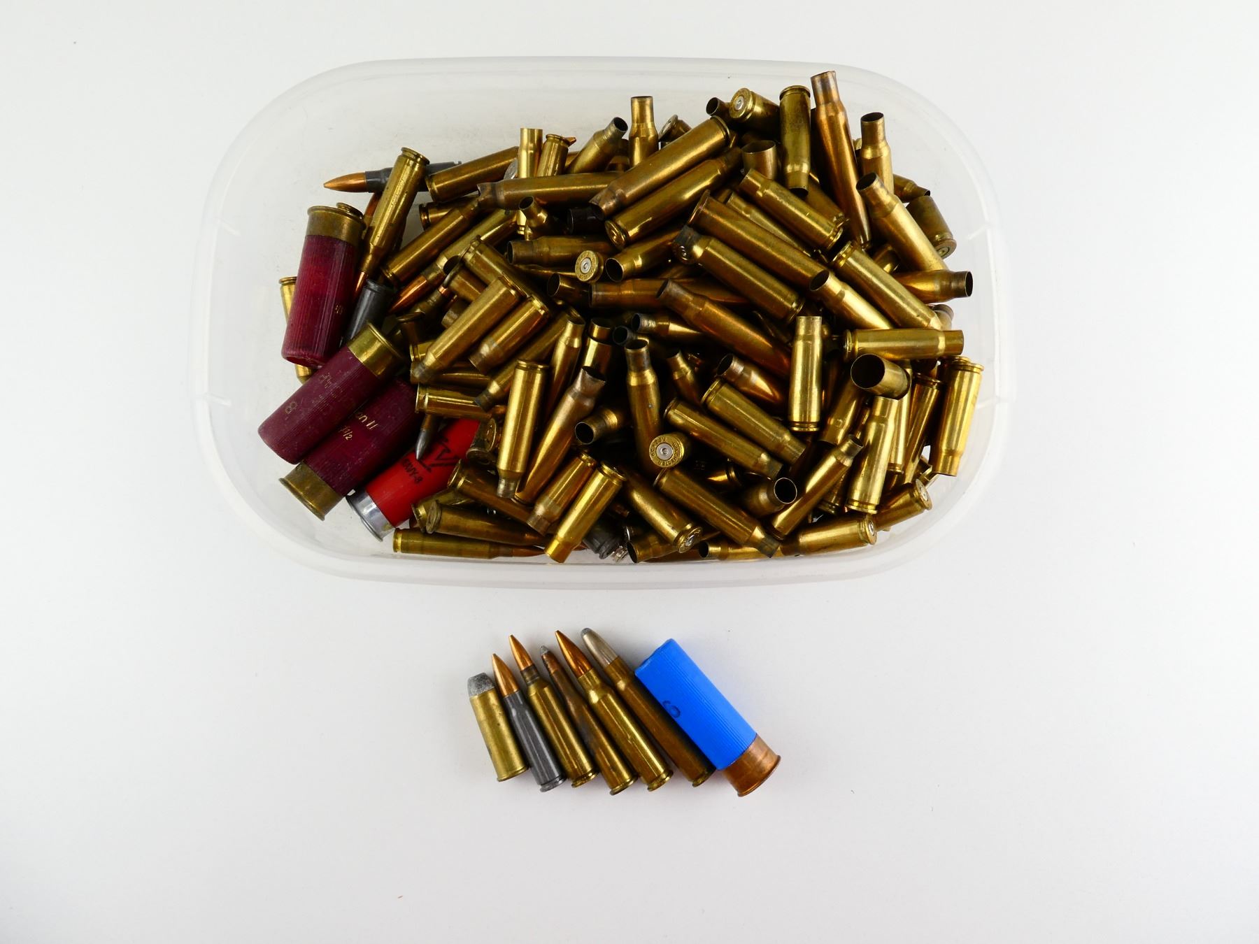 LOT INCLUDES; APPROX. (143) RNDS, VARIOUS CALIBERS INCLUDING; .44 WCF, .22 S HP, .22-250, .308 WIN, 8X57 JS, ETC., CONTAINS SOME FACTORY RNDS, (123) NON-PRIMED ASSORTED BRASS CASES.