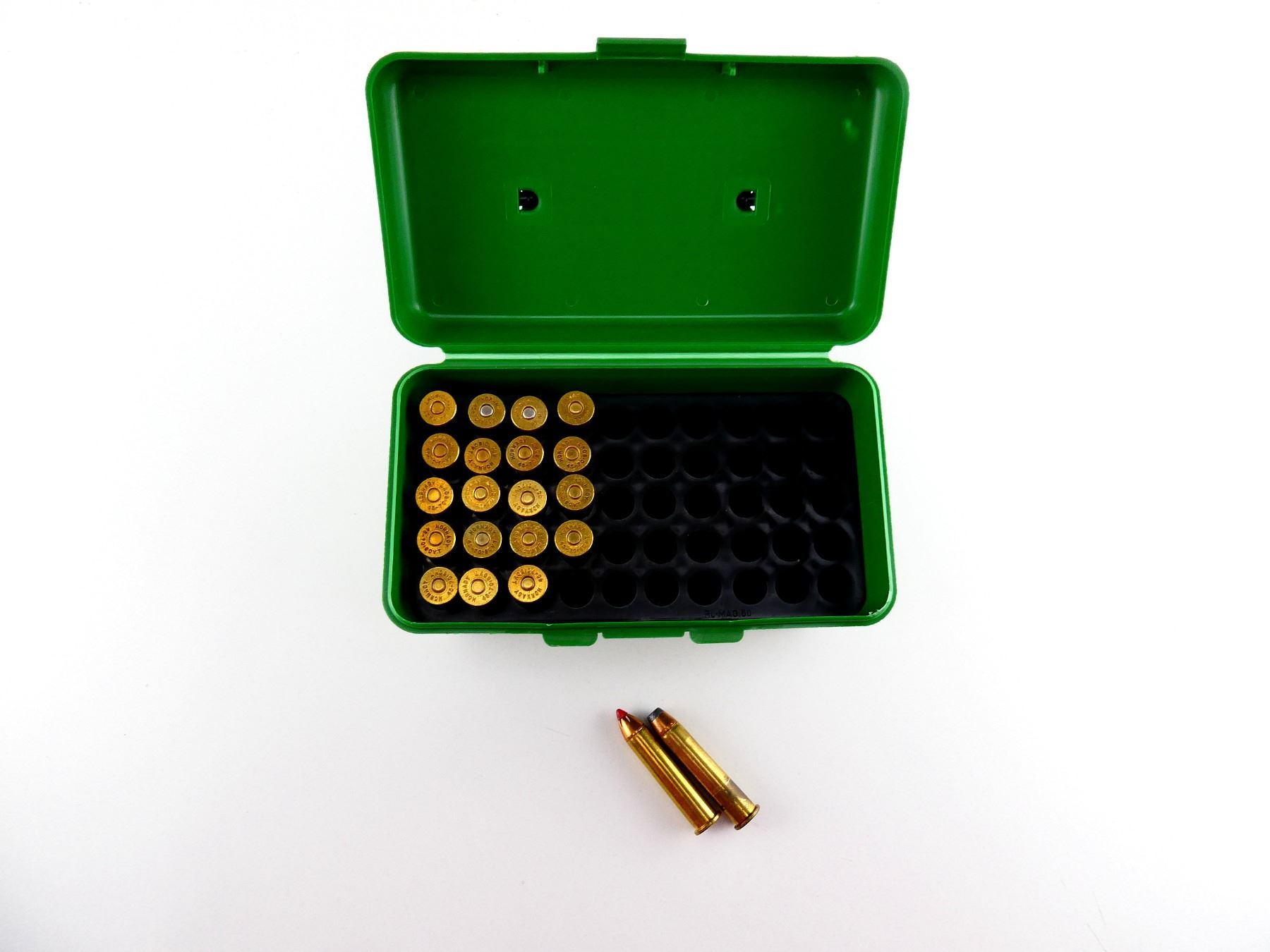 LOT INCLUDES; APPROX. (21) RNDS, (1) MTM CASE-GARD H-50 PLASTIC AMMO BOX.