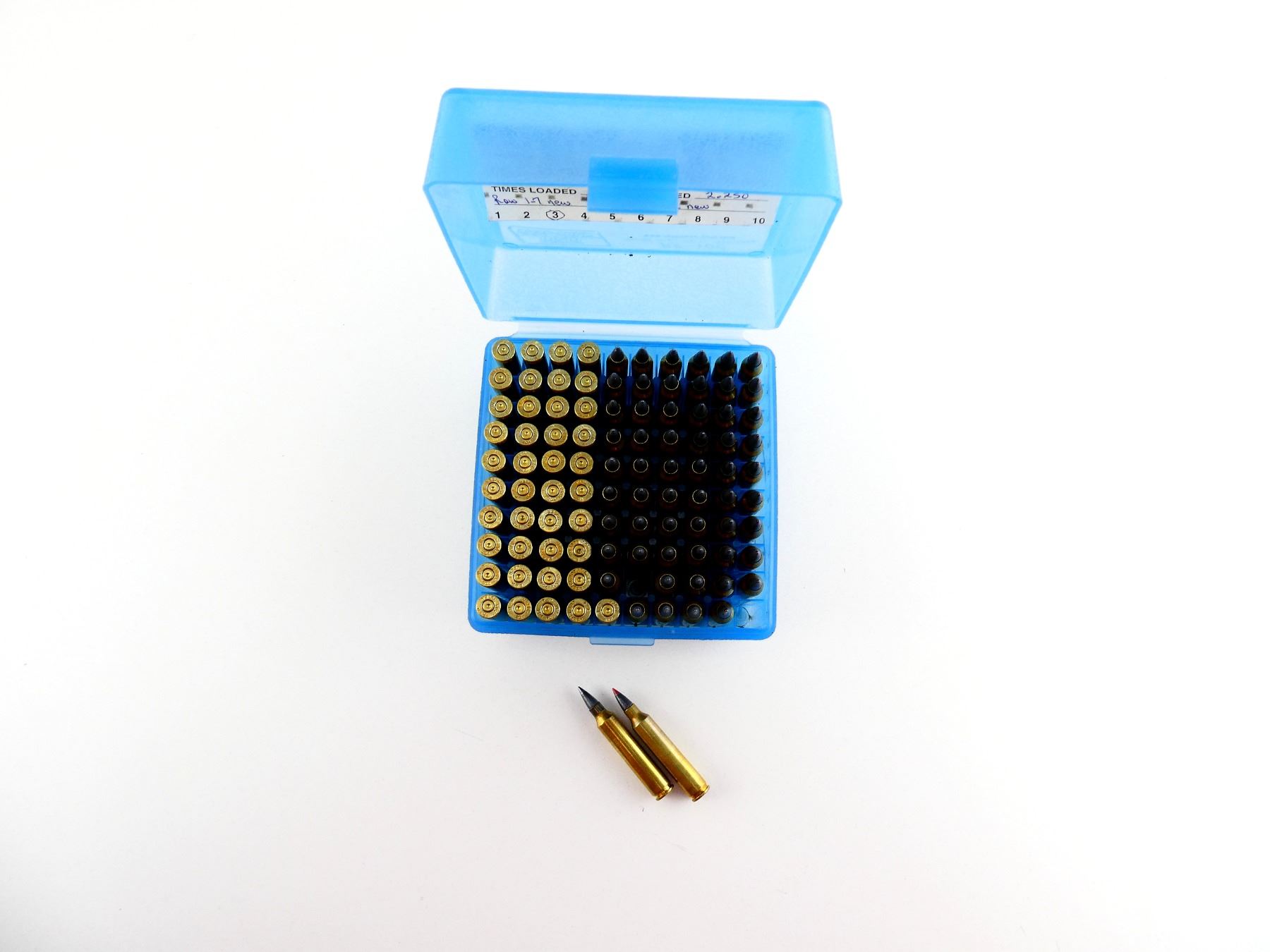 LOT INCLUDES; APPROX. (59) RNDS, CONSIGNOR STATES; "40 GRNS HORNADY V-MAX", NOT CONFIRMED, (41) NON-PRIMED BRASS CASES, (1) CASE-GARD 50 PLASTIC AMMO BOX.