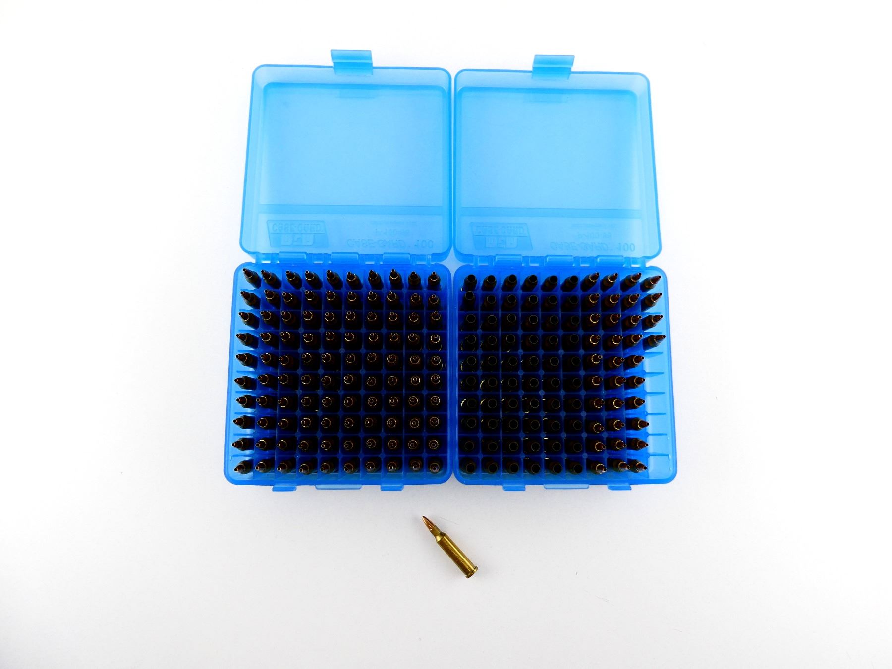 LOT INCLUDES; APPROX. (135) RNDS, CONSIGNOR STATES; "25 GRNS HP", NOT CONFIRMED, (60) NON-PRIMED BRASS CASES, (2) MTM CASE-GARD P-100-38 PLASTIC AMMO BOXES.