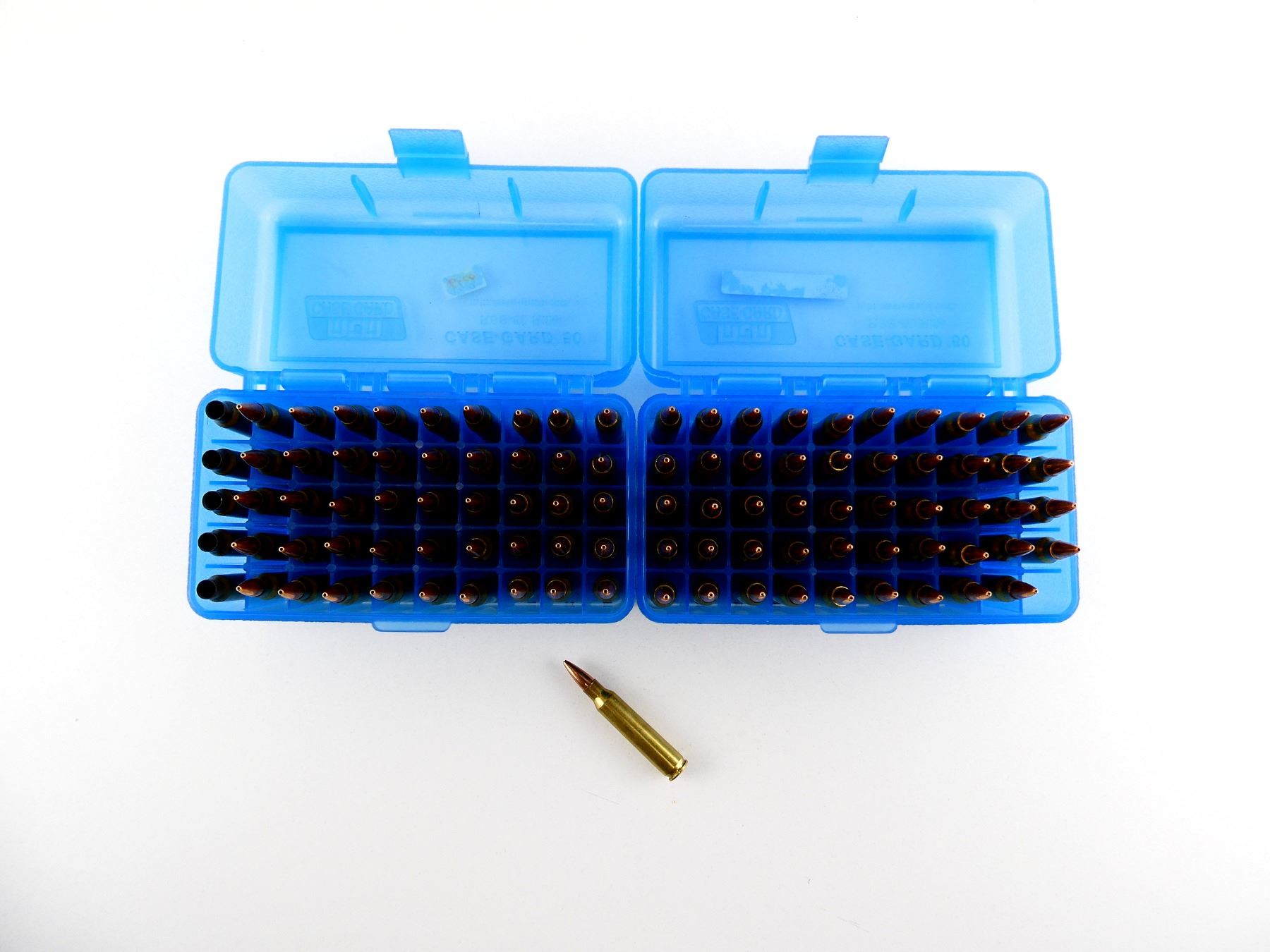 LOT INCLUDES; APPROX. (95) RNDS, CONSIGNOR STATES; "53 GRNS HP", NOT CONFIRMED, (5) NON-PRIMED BRASS CASES, (2) MTM CASE-GARD 50 PLASTIC AMMO BOXES.