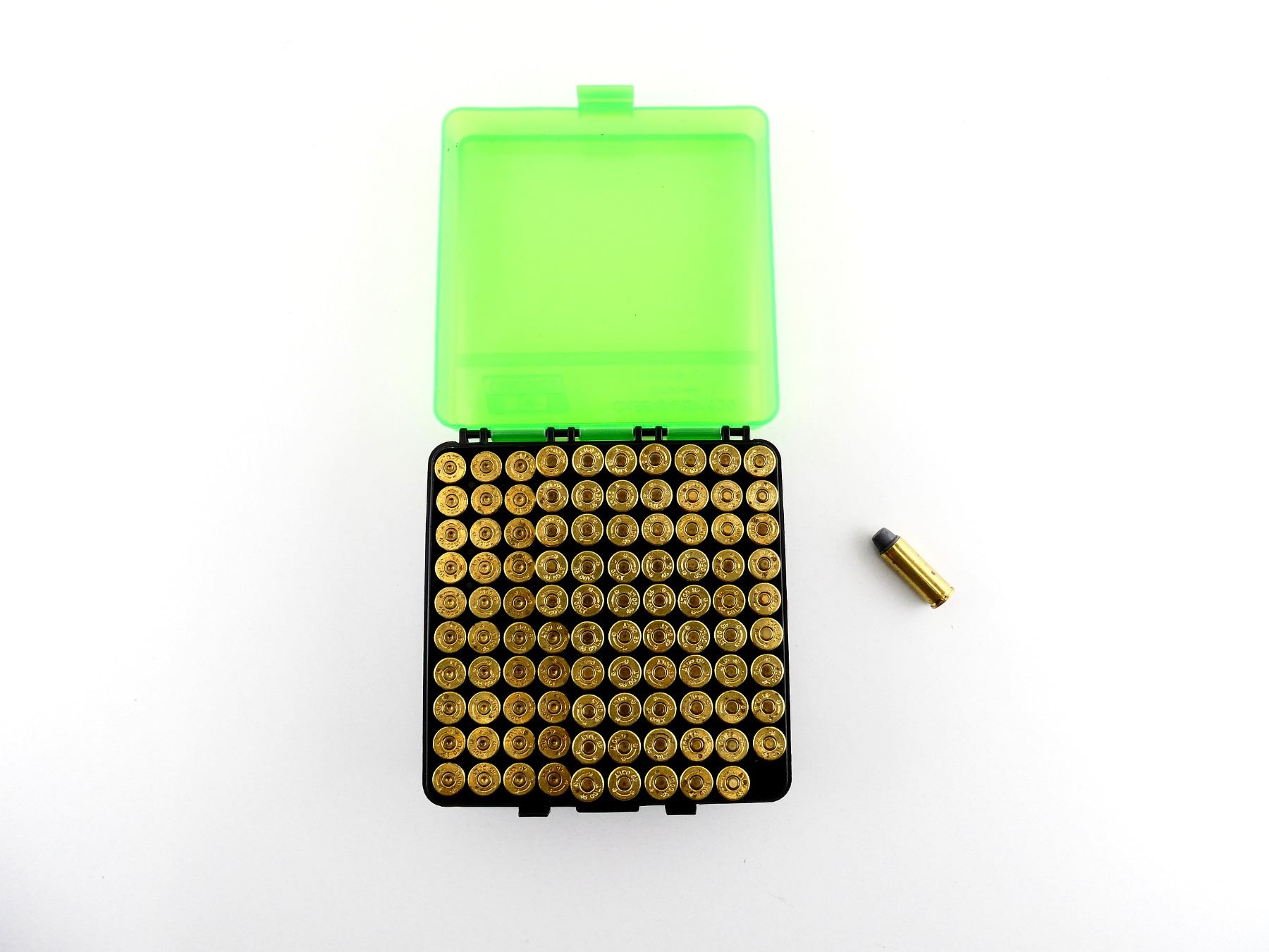 LOT INCLUDES; APPROX. (65) RNDS, (35) NON-PRIMED BRASS CASES, (1)MTM CASE-GARD 100 PLASTIC AMMO BOX.
