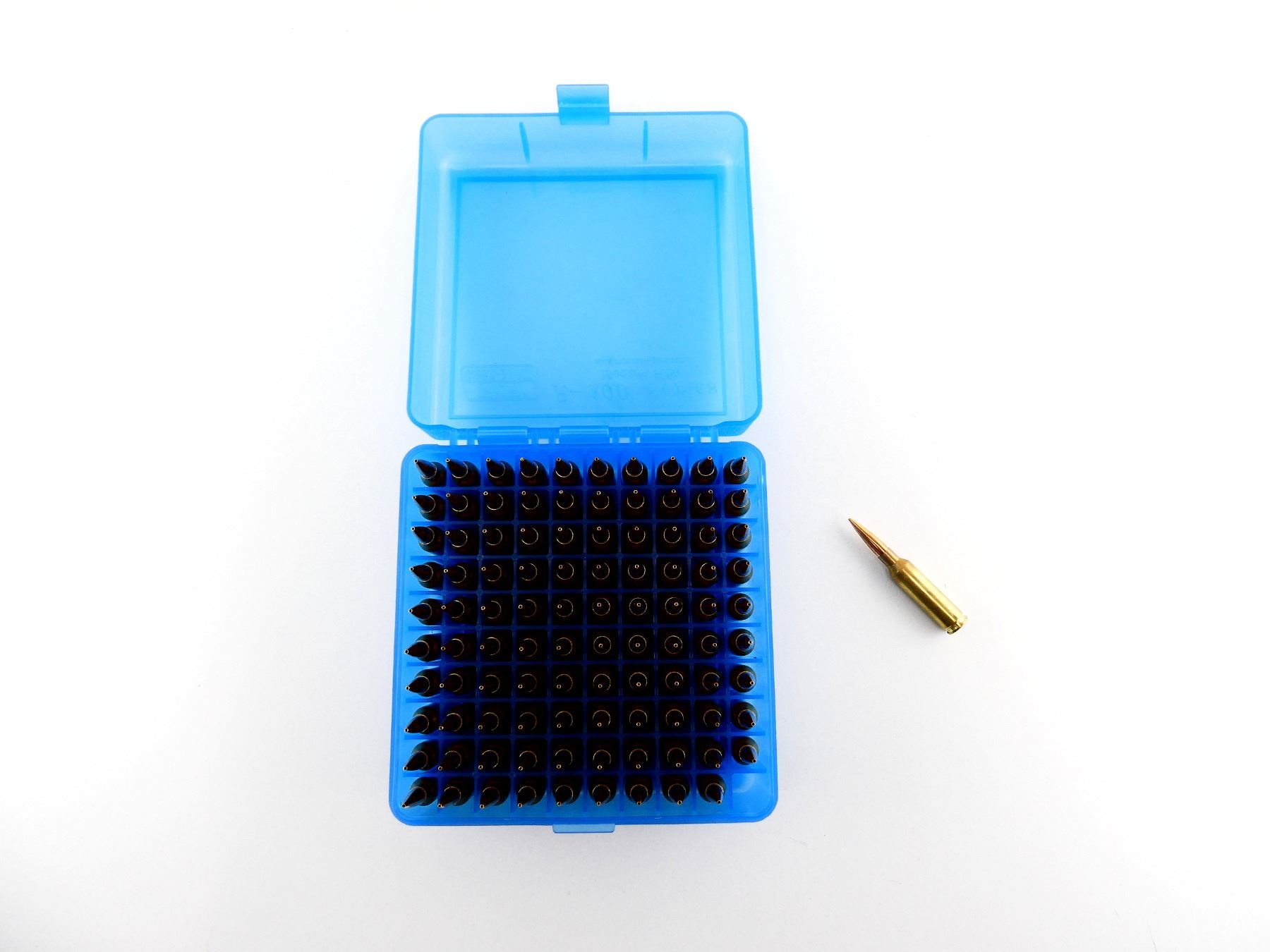 LOT INCLUDES; APPROX. (100) RNDS, CONSIGNOR STATES; "140 GRNS VLD TARGET", NOT CONFIRMED, (1) MTM CASE-GARD 100 PLASTIC AMMO BOX.