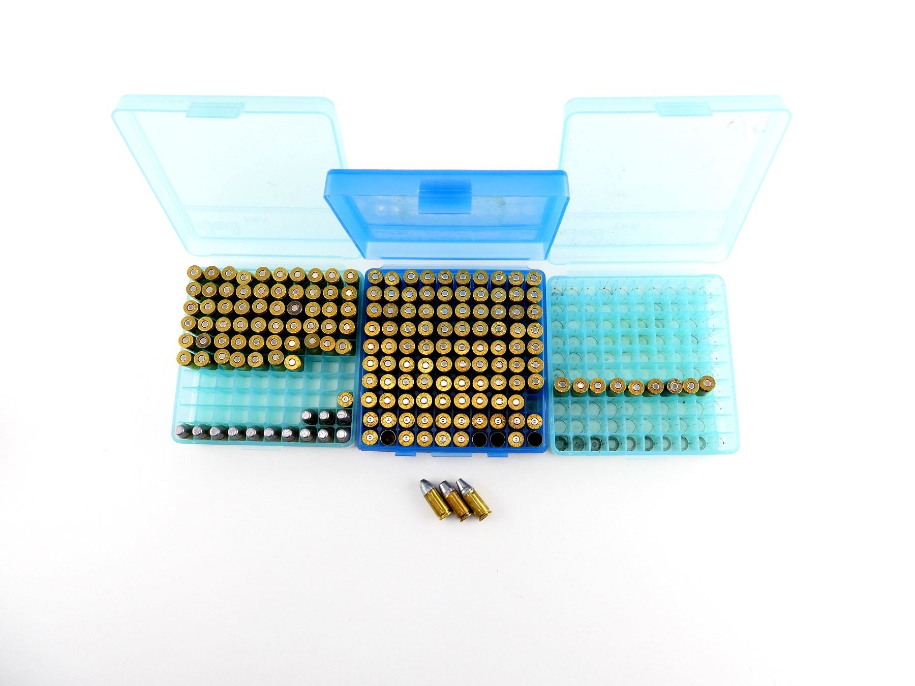 LOT INCLUDES; APPROX. (161) RNDS, (21) NON-PRIMED BRASS CASES, (3) PLASTIC AMMO BOXES.