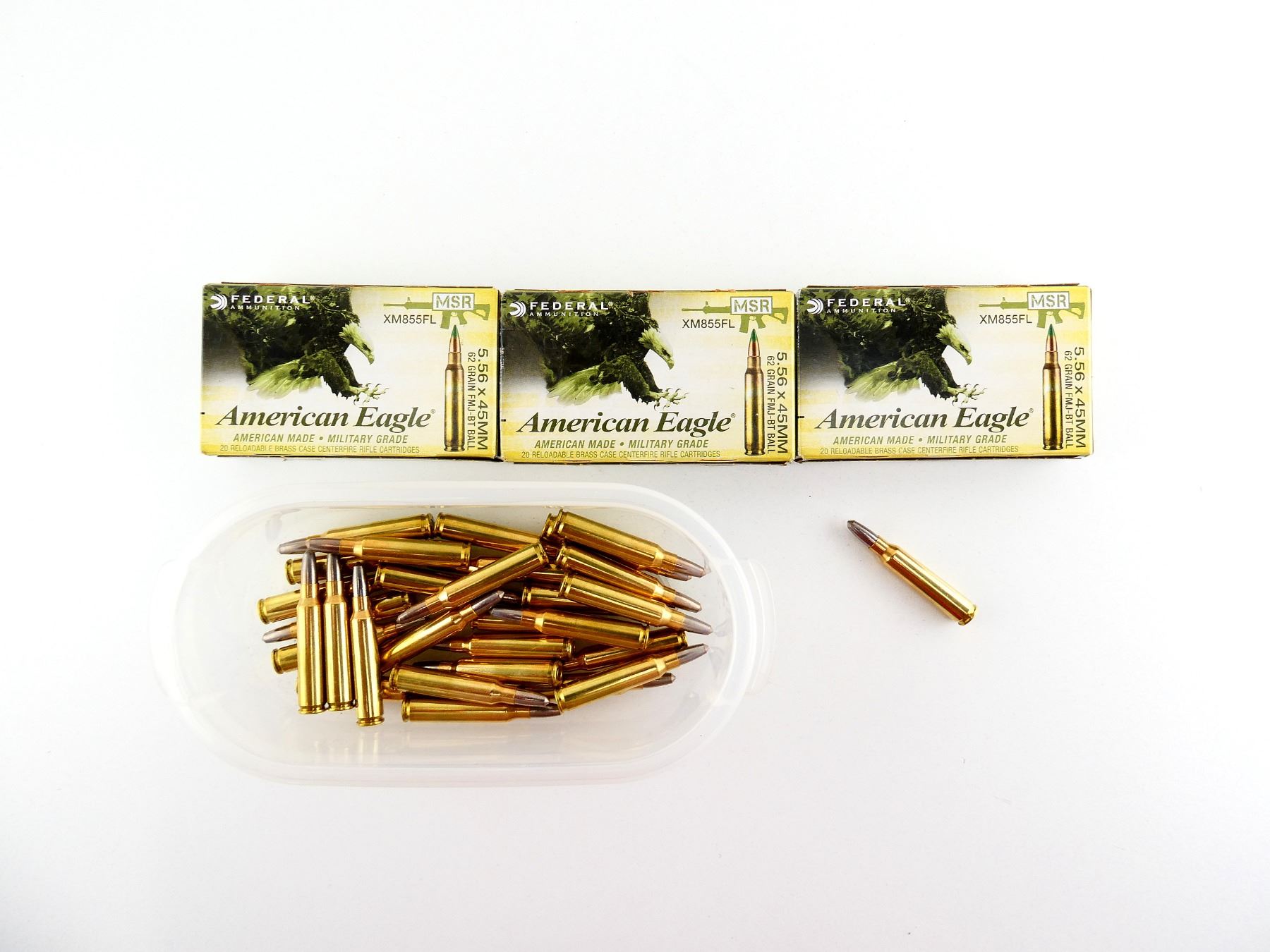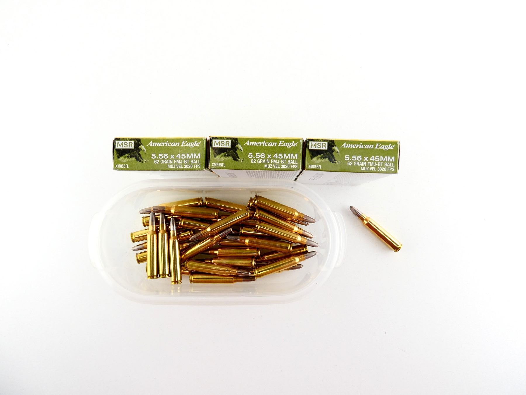 LOT INCLUDES; APPROX. (90) RNDS, 62 GRNS (STATED ON BOXES NOT CONFIRMED), FMJ-BT BALL, ETC., VARIOUS MANUFACTURERS INCLUDING; FEDERAL AMERICAN EAGLE & PMC, (3) UNOPENED.