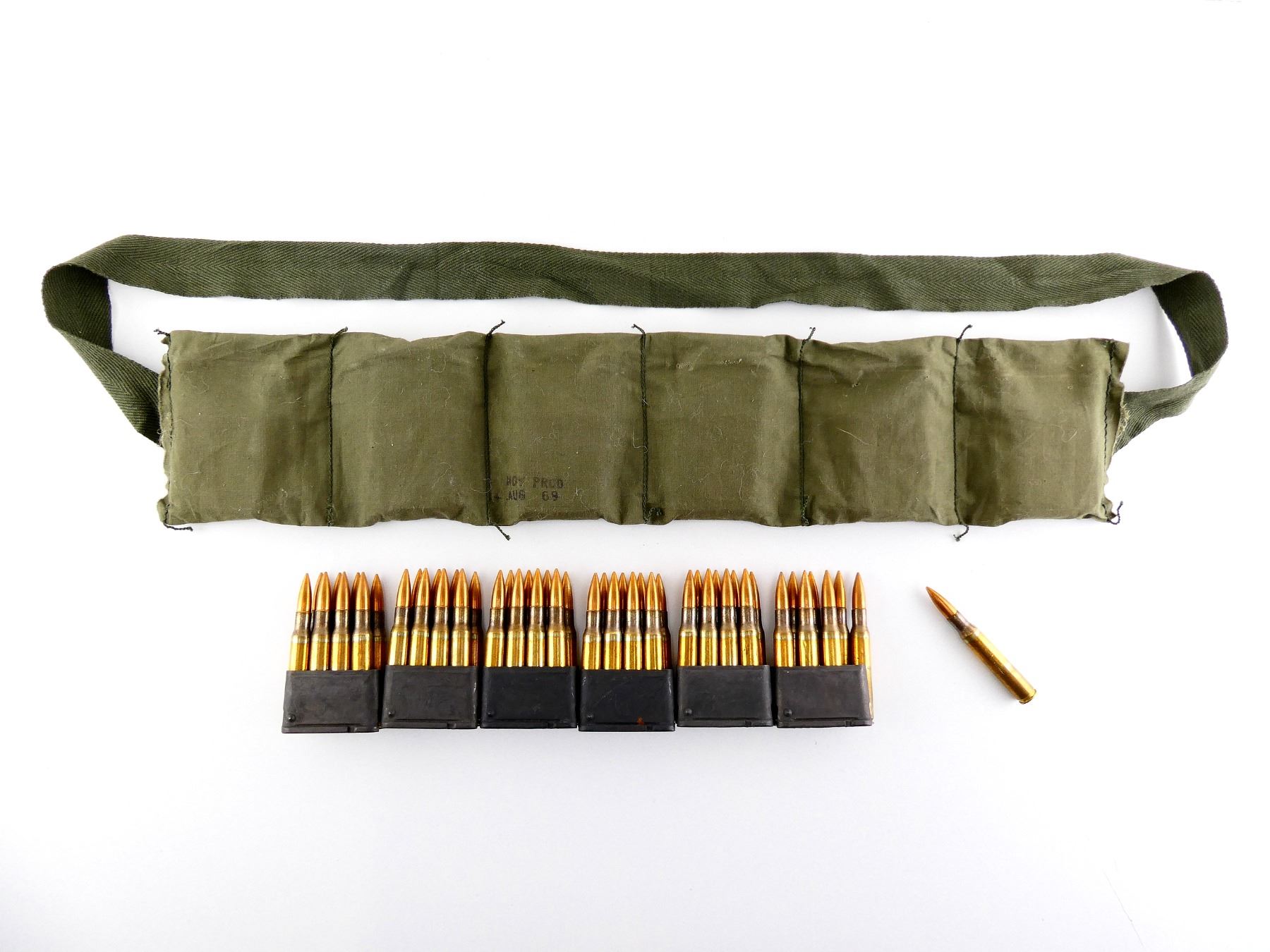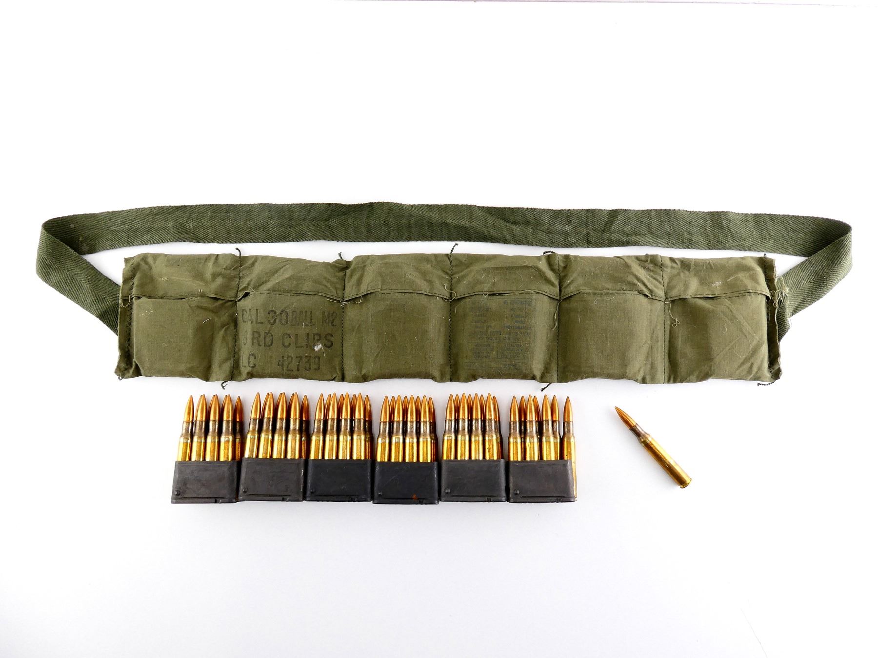 LOT INCLUDES; APPROX. (48) RNDS, FMJ, (6) ENBLOCS, (1) GREEN BANDOLIER.