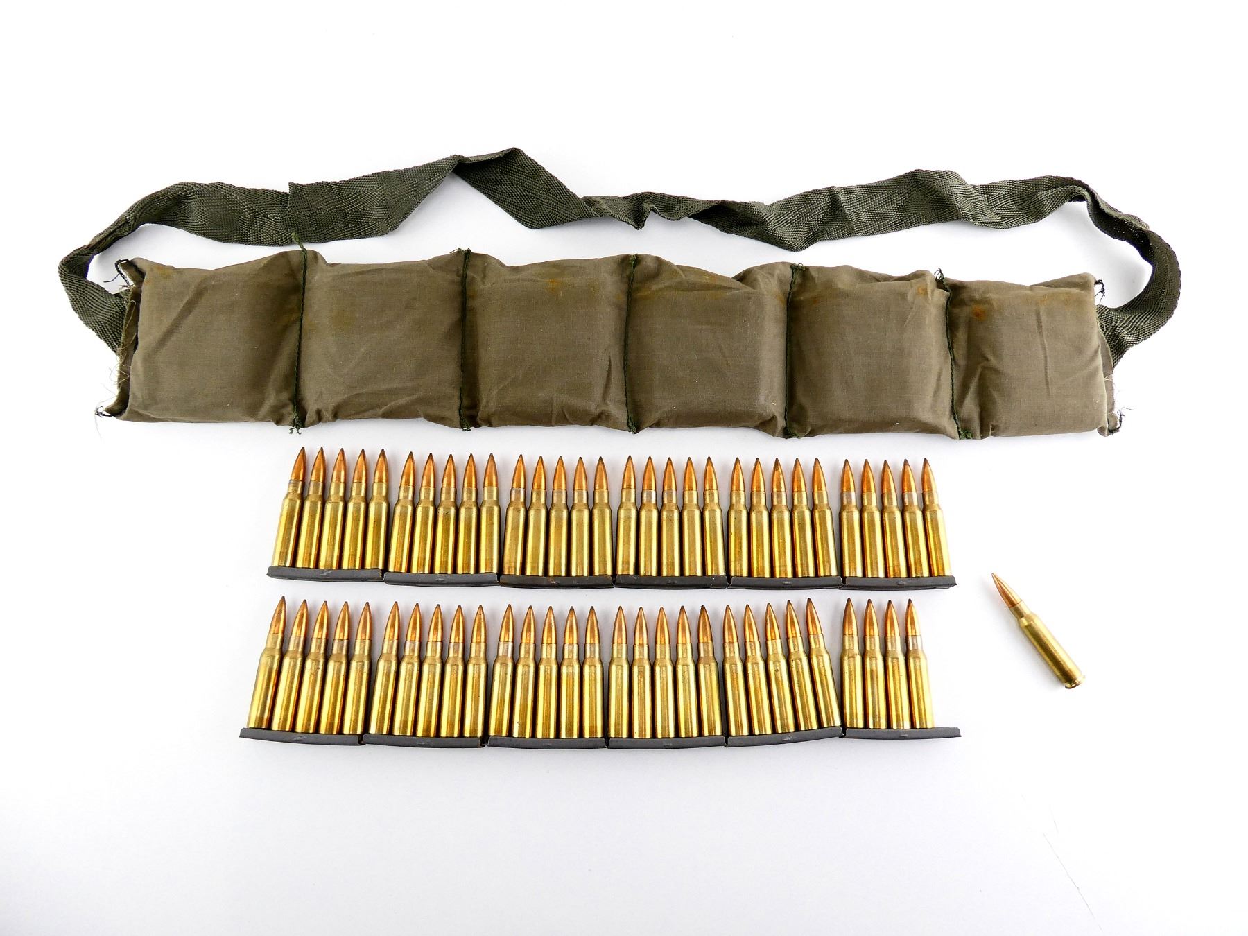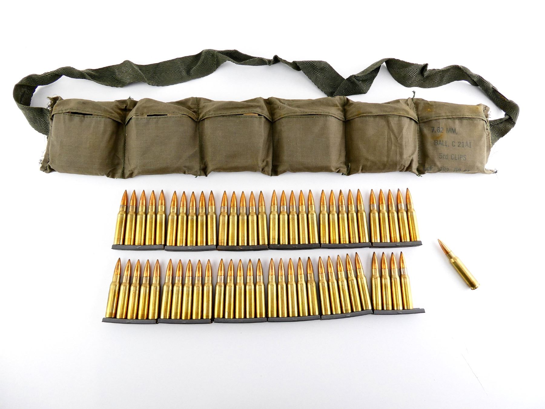 LOT INCLUDES; APPROX. (60) RNDS, FMJ, (12) STRIPPER CLIPS, (1) GREEN BANDOLIER.