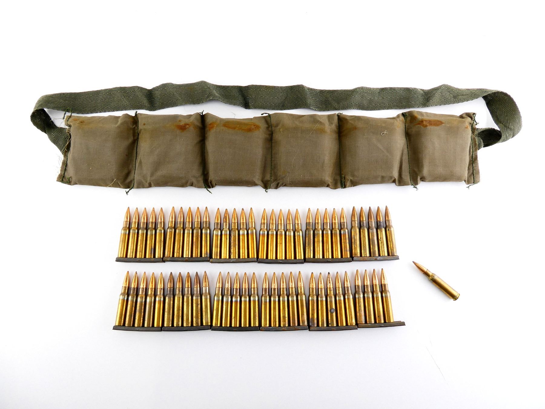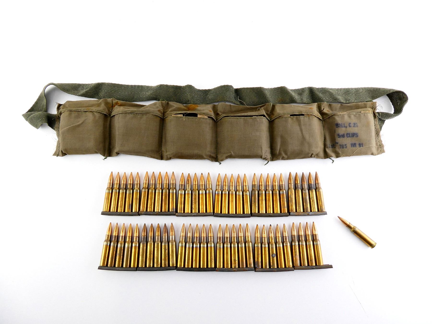 LOT INCLUDES; APPROX. (60) RNDS, FMJ, (12) STRIPPER CLIPS, (1) GREEN BANDOLIER.