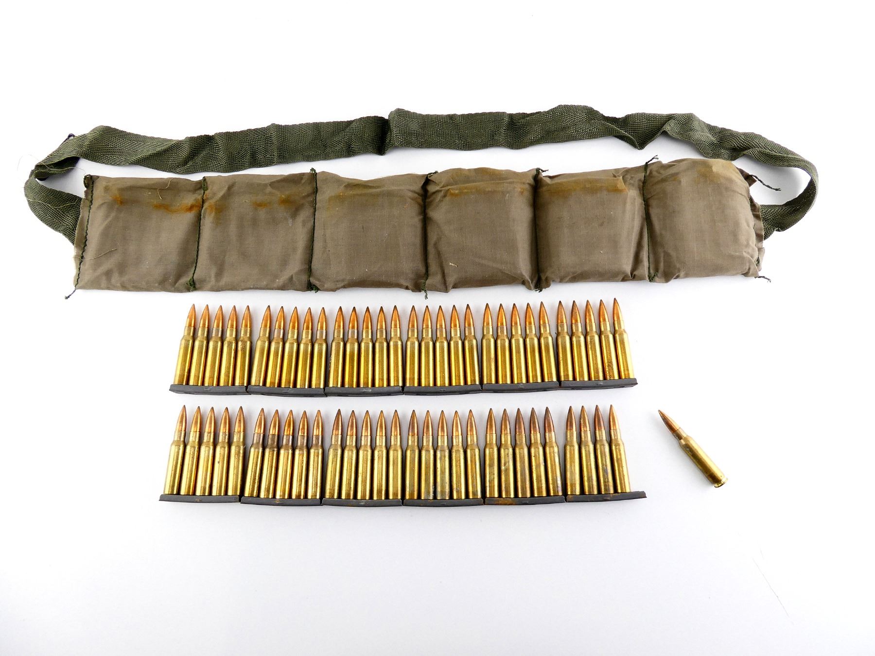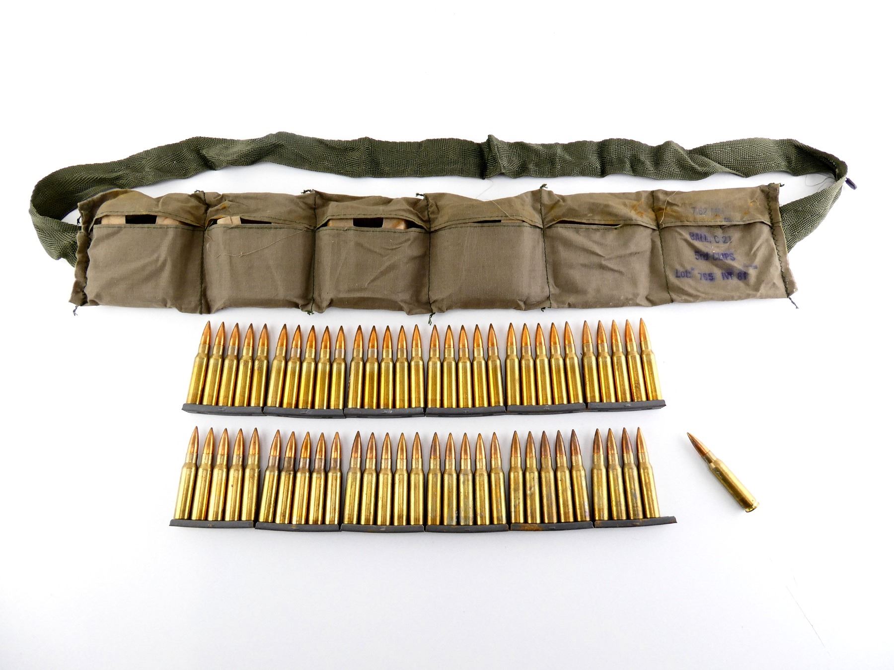 LOT INCLUDES; APPROX. (60) RNDS, FMJ, (12) STRIPPER CLIPS, (1) GREEN BANDOLIER.