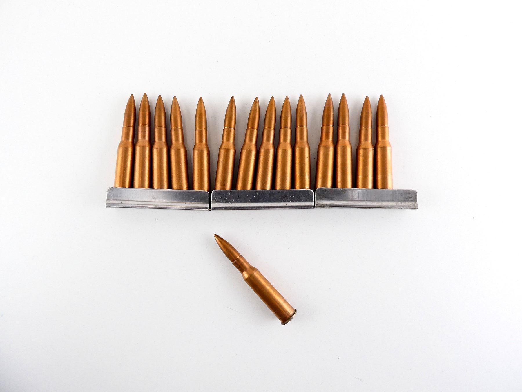 LOT INCLUDES; APPROX. (15) RNDS, FMJ, COPPER WASHED, (3) MOSIN NAGANT STRIPPER CLIPS.