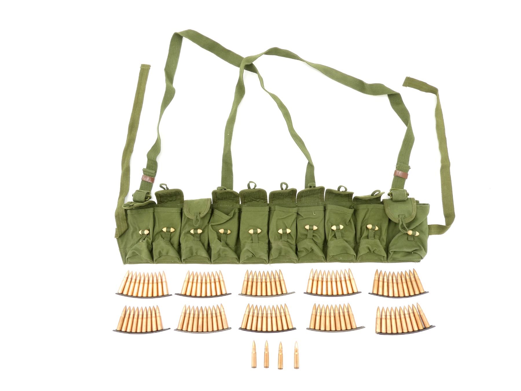 LOT INCLUDES; APPROX. (100) RNDS, FMJ, COPPER WASHED, (1) SKS BANDOLIERS, GREEN CANVAS WITH STRAPS, VARIOUS MARKINGS, (10) STRIPPER CLIPS.