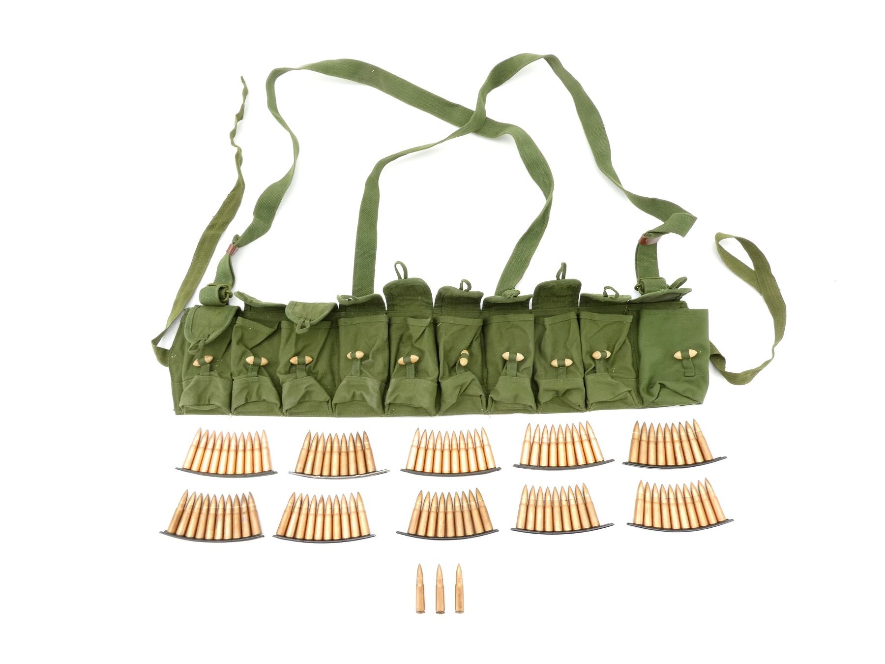 LOT INCLUDES; APPROX. (100) RNDS, FMJ, COPPER WASHED, (1) SKS BANDOLIERS, GREEN CANVAS WITH STRAPS, VARIOUS MARKINGS, (10) STRIPPER CLIPS.