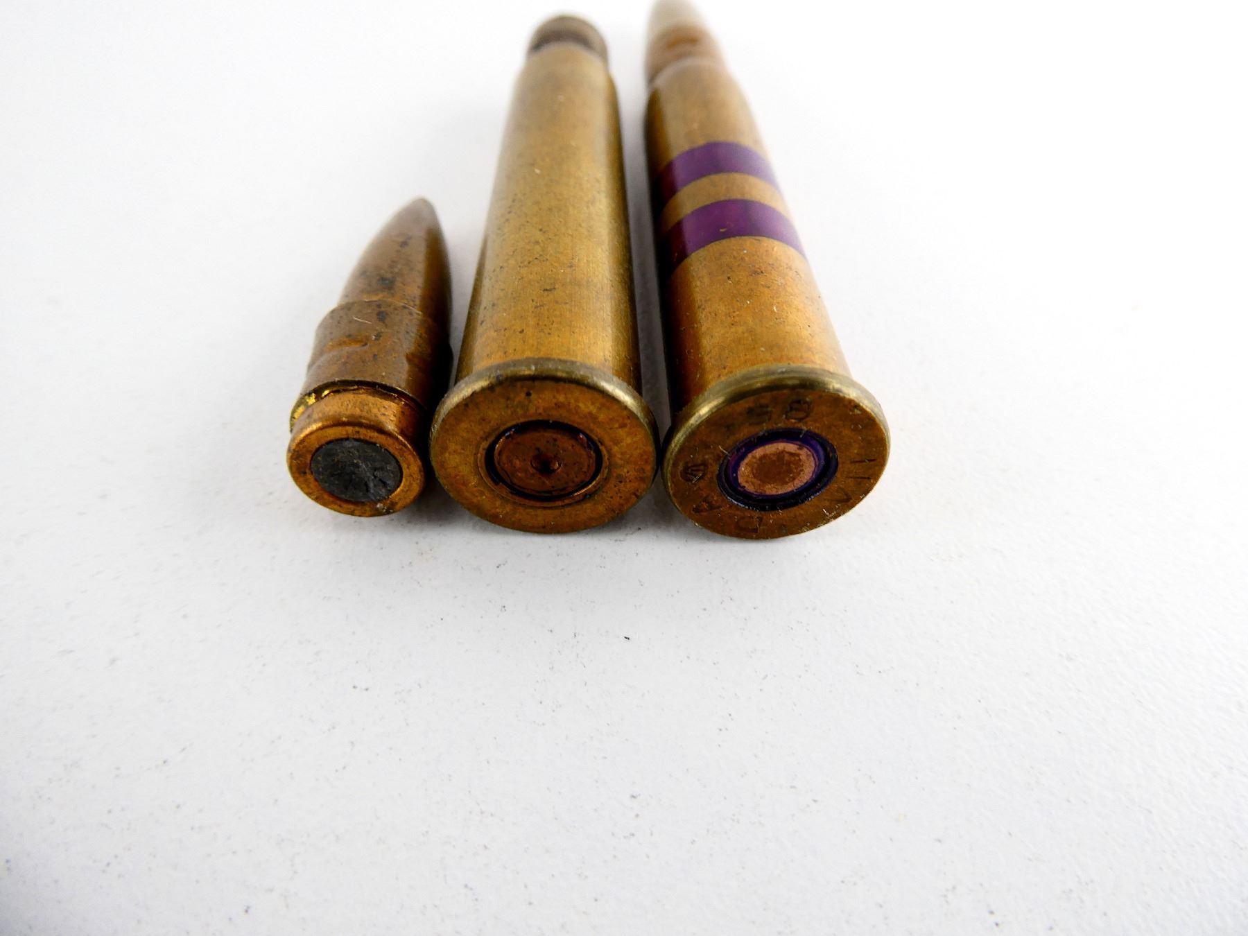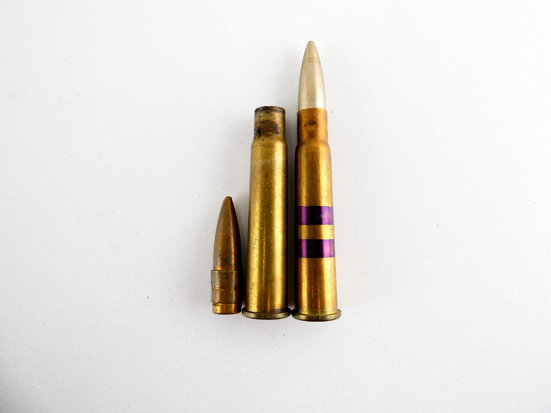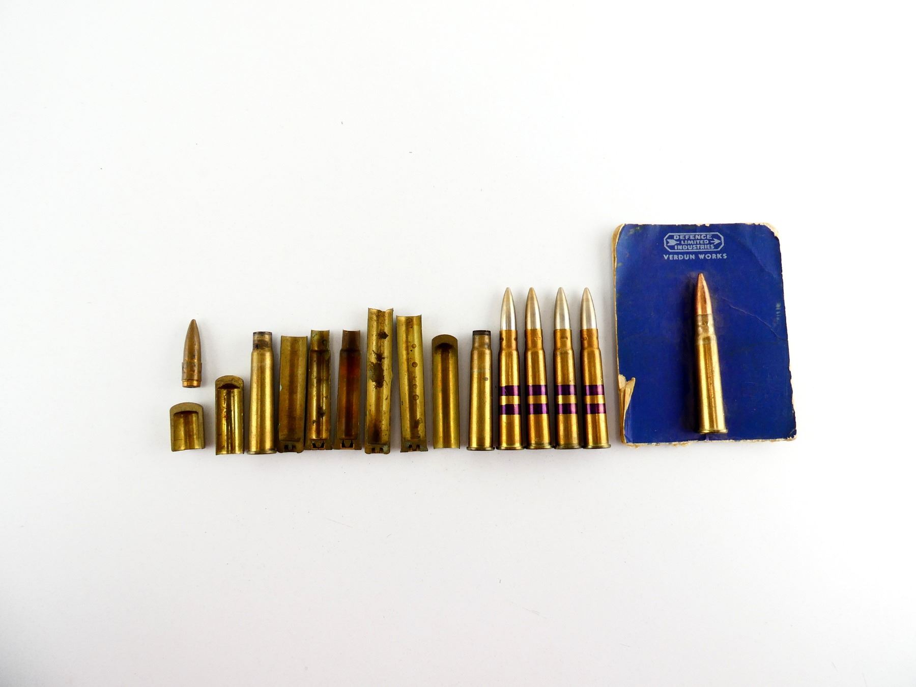 LOT INCLUDES; APPROX. (5) RNDS, FMJ, DATED 38, 43, (2) NON-PRIMED BRASS CASES, VARIOUS BRASS CASES CUT IN HALF, ETC.