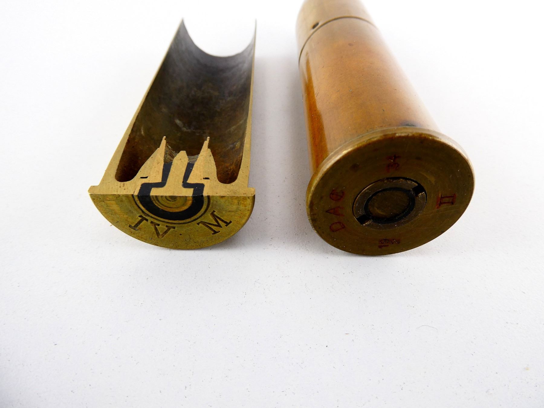 LOT INCLUDES; (1) RNDS, MARKED DAC II 1934, (1) CUT AWAY BRASS CASE.