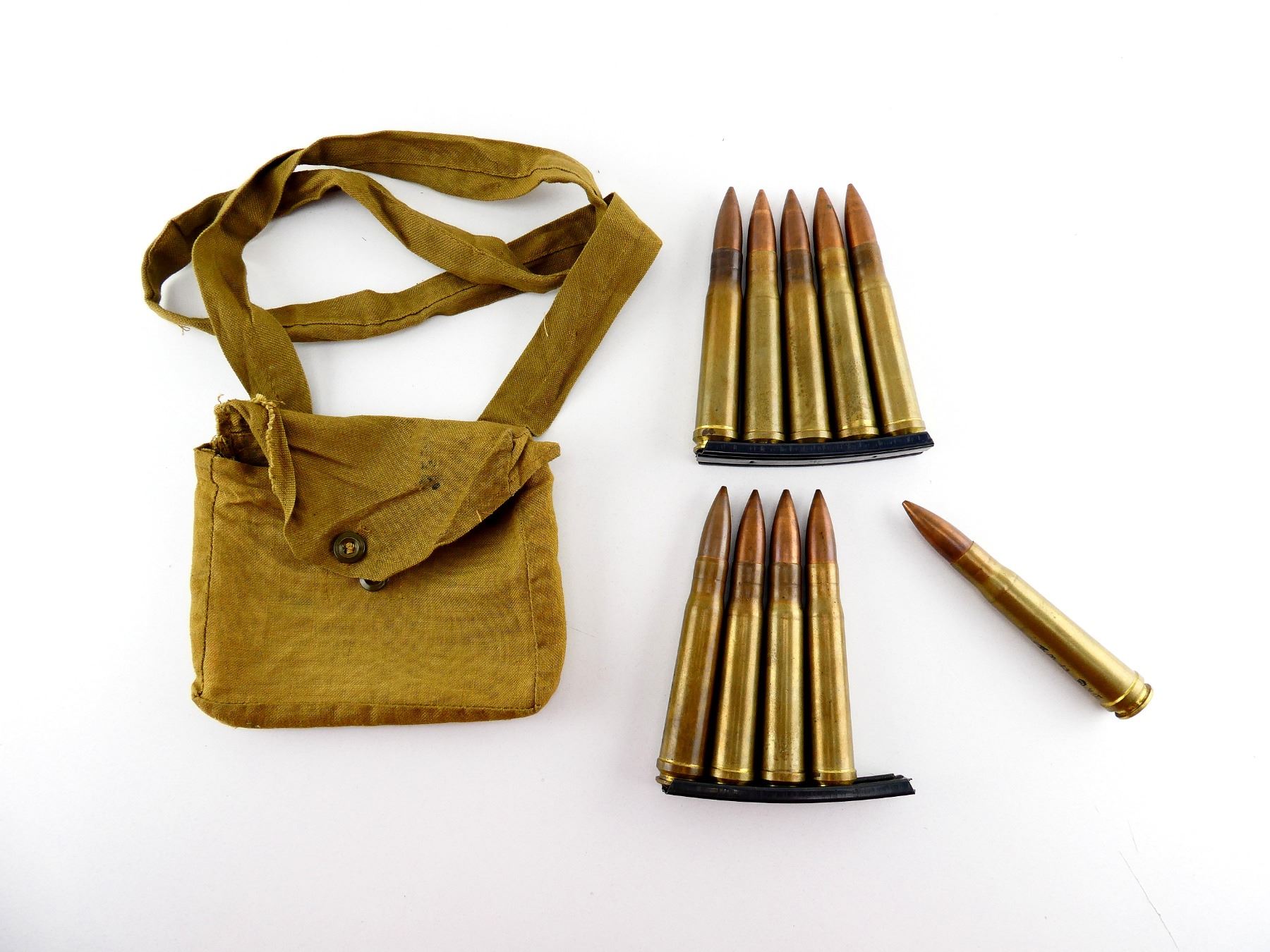 LOT INCLUDES; APPROX. (10) RNDS, FMJ, (2) STRIPPER CLIPS, (1) GREEN BANDOLIER MARKED TAPATCO MAY 1943 NO. 55.