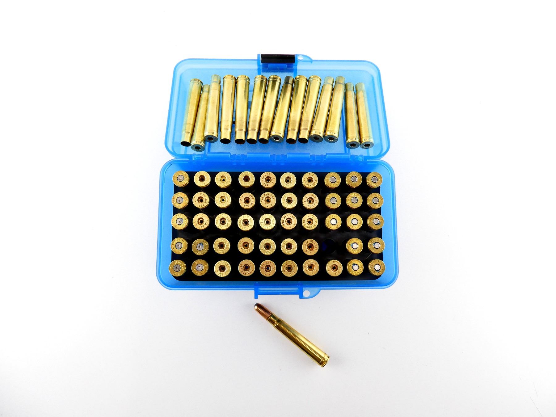 LOT INCLUDES; APPROX. (14) RNDS, SP, (50) NON-PRIMED BRASS CASES, (1) MTM CASE-GARD PLASTIC AMMO BOX.