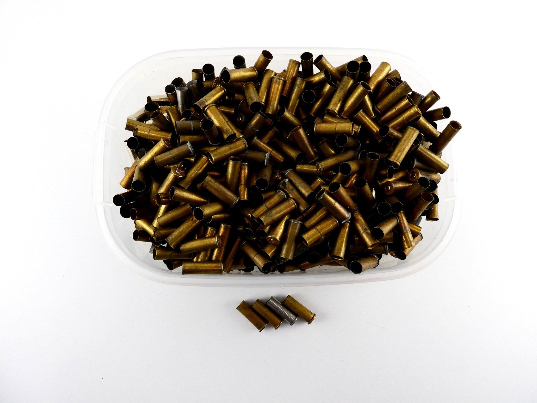 LOT INCLUDES; APPROX. (197) PRIMED .38 SPL BRASS CASES, APPROX. 4.2 LBS NON-PRIMED CASES, VARIOUS CALIBERS INCLUDING; 9MM LUGER, .38 SPL, .44 MAGNUM, .45 AUTO, ETC.
