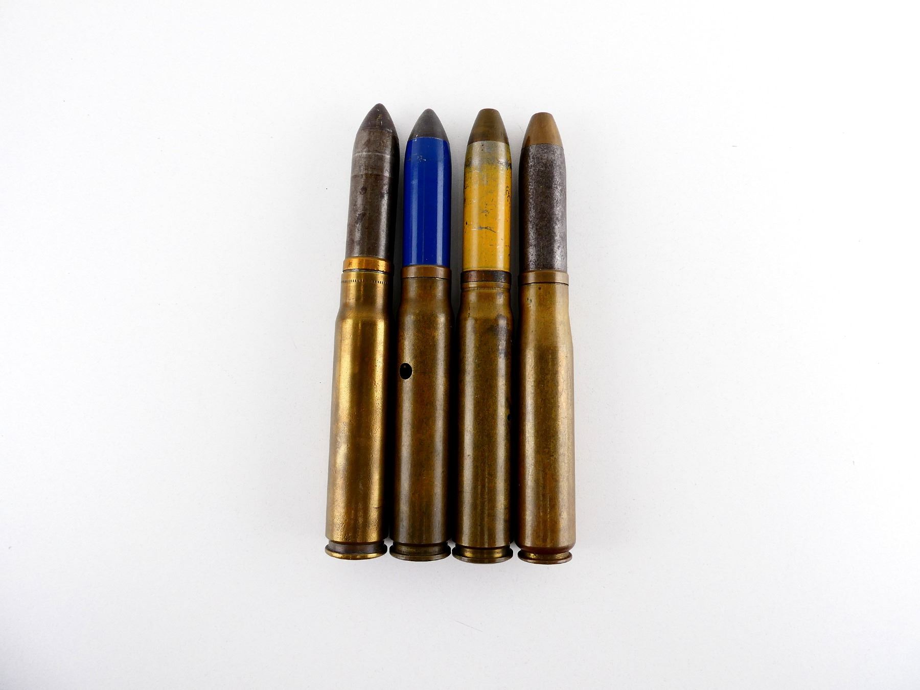 LOT INCLUDES;(1) PRIMED BRASS CASE WITH PROJECTILE, (3) NON-PRIMED BRASS CASES WITH PROJECTILES.
