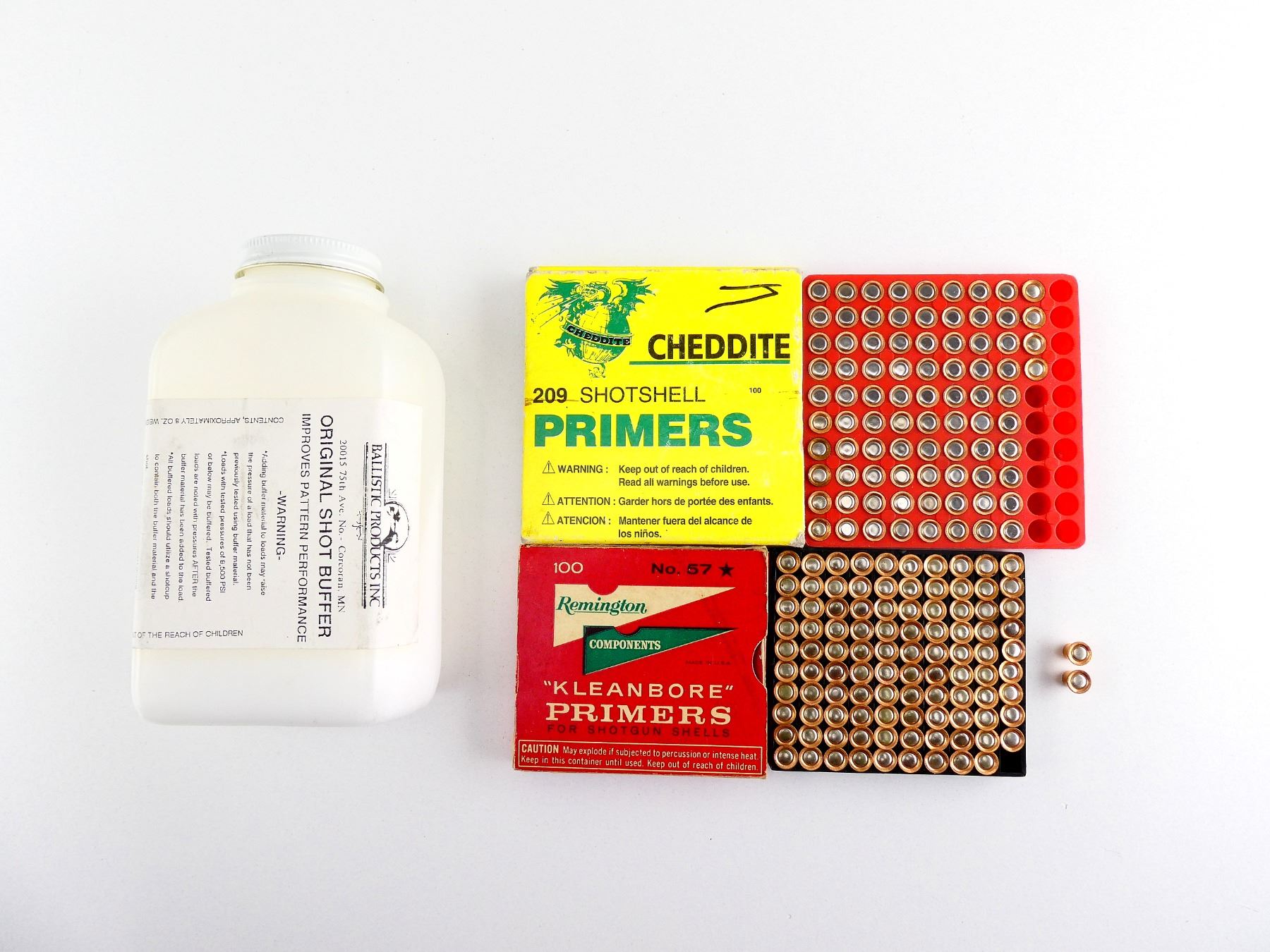 LOT INCLUDES; APPROX. (185) PRIMERS, (1) PART BOTTLE OF ORIGINAL SHOT BUFFER.