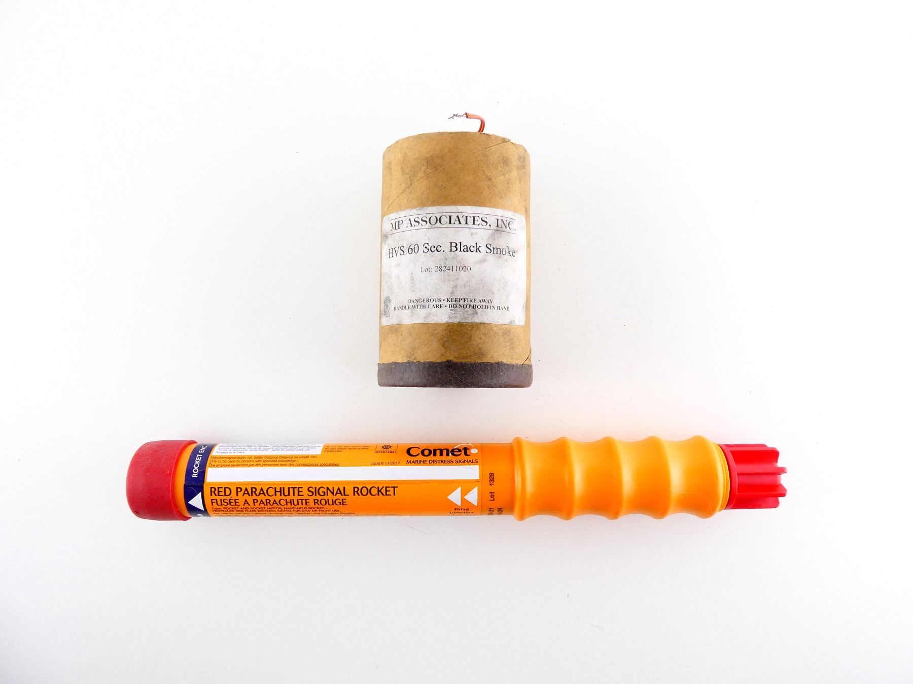 LOT INCLUDES; (1) COMET RED PARACHUTE SIGNAL ROCKET, DATE OF MANUFACTURING 5/21 LOT 1328 DATE OF EXPIRY 11/24, (1) MP ASSOCIATES HVS 60 SEC BLACK SMOKE.