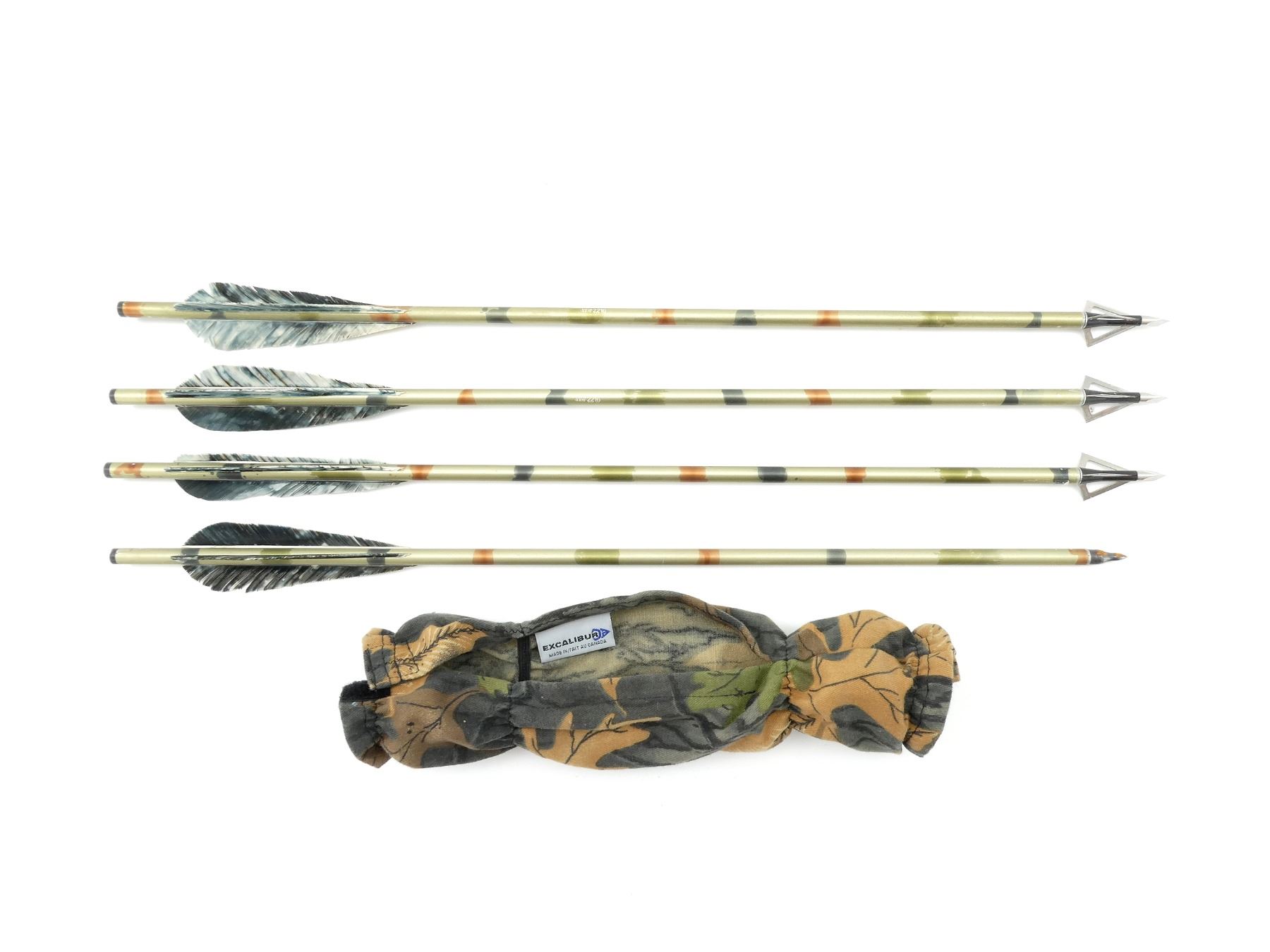 LOT INCLUDES; (1) EXCALIBUR PARADOX COMPOUND CROSS BOW, APPROX 175 LBS DRAW WEIGHT, APPROX 335 FPS, DRAW LENGTH 12", STRING, (1) EXCALIBUR MAX ZONE (4) RETICLE SCOPE, CLEAR OPTICS, LENS COVERS, (1) (4) BOLT QUIVER, (4) 20" ALUMINUM BOLTS, (3) FIXED BLADE BROADHEADS, (1) FIELD TIP, SCOPE COVER, (1) BOE SLING, (1) CAMO PADDED COW CASE WITH SHOULDER STRAPS, APPROX OVERALL LENGTH 39", SHOWS WEAR AND TEAR FROM USAGE, SEE PHOTOS.