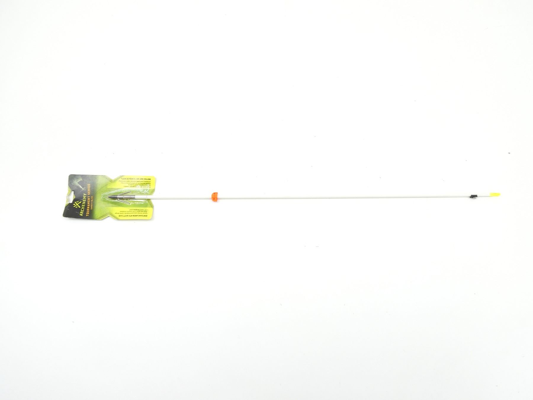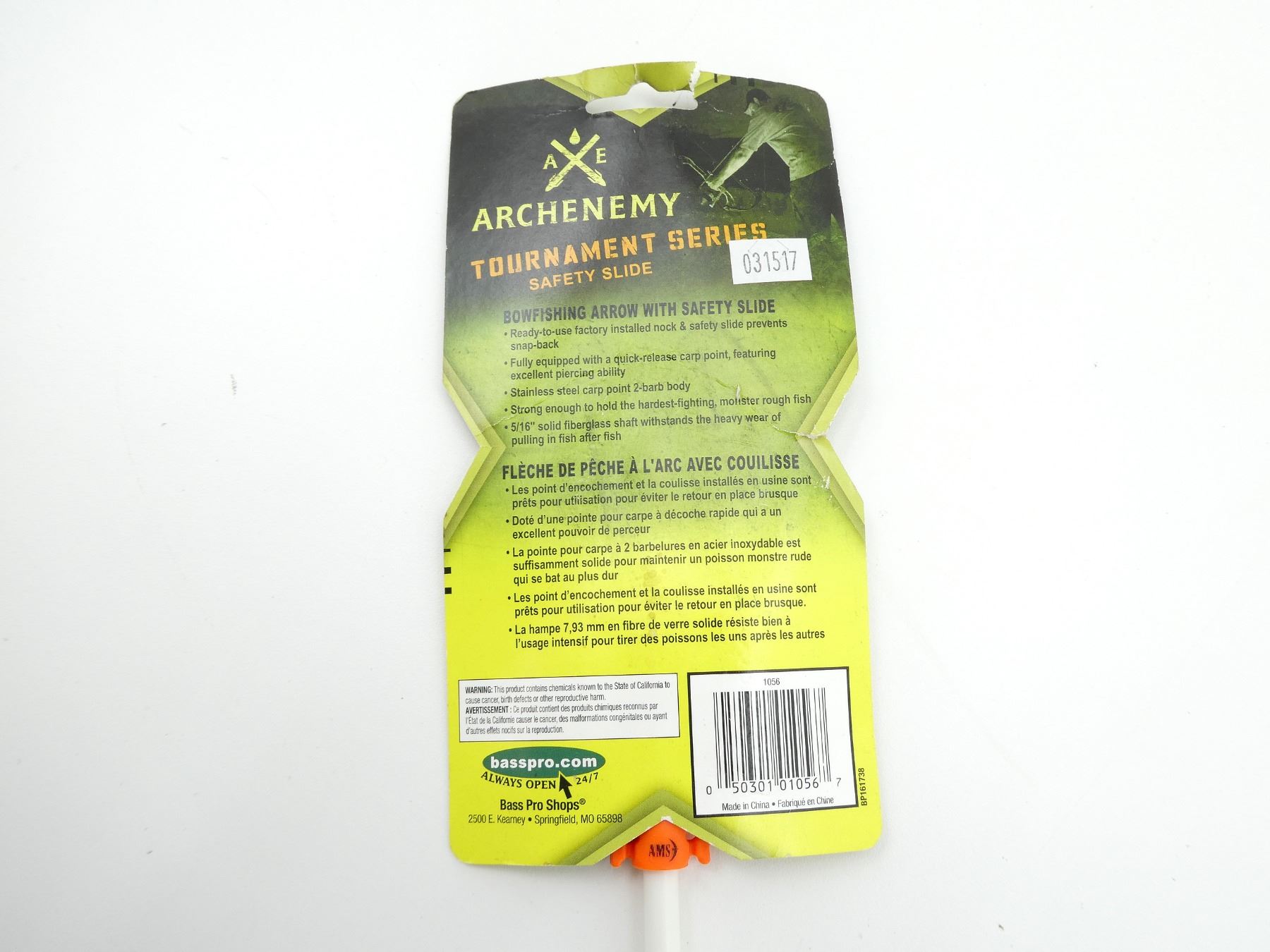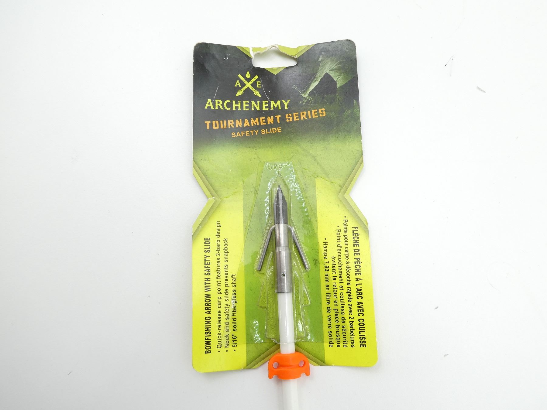 LOT INCLUDES; (1) ARCHENEMY TOURNAMENT SERIES BOWFISHING ARROW, QUICK-RELEASE CARP POINT FEATURES 2-BLADE DESIGN, NOCK AND SAFETY SLIDE PREVENTS SNAPBACK, 5/16" SOLID FIBERGLASS SHAFT, APPROX. OAL34", NEW OLD STOCK, SEE PHOTOS.
