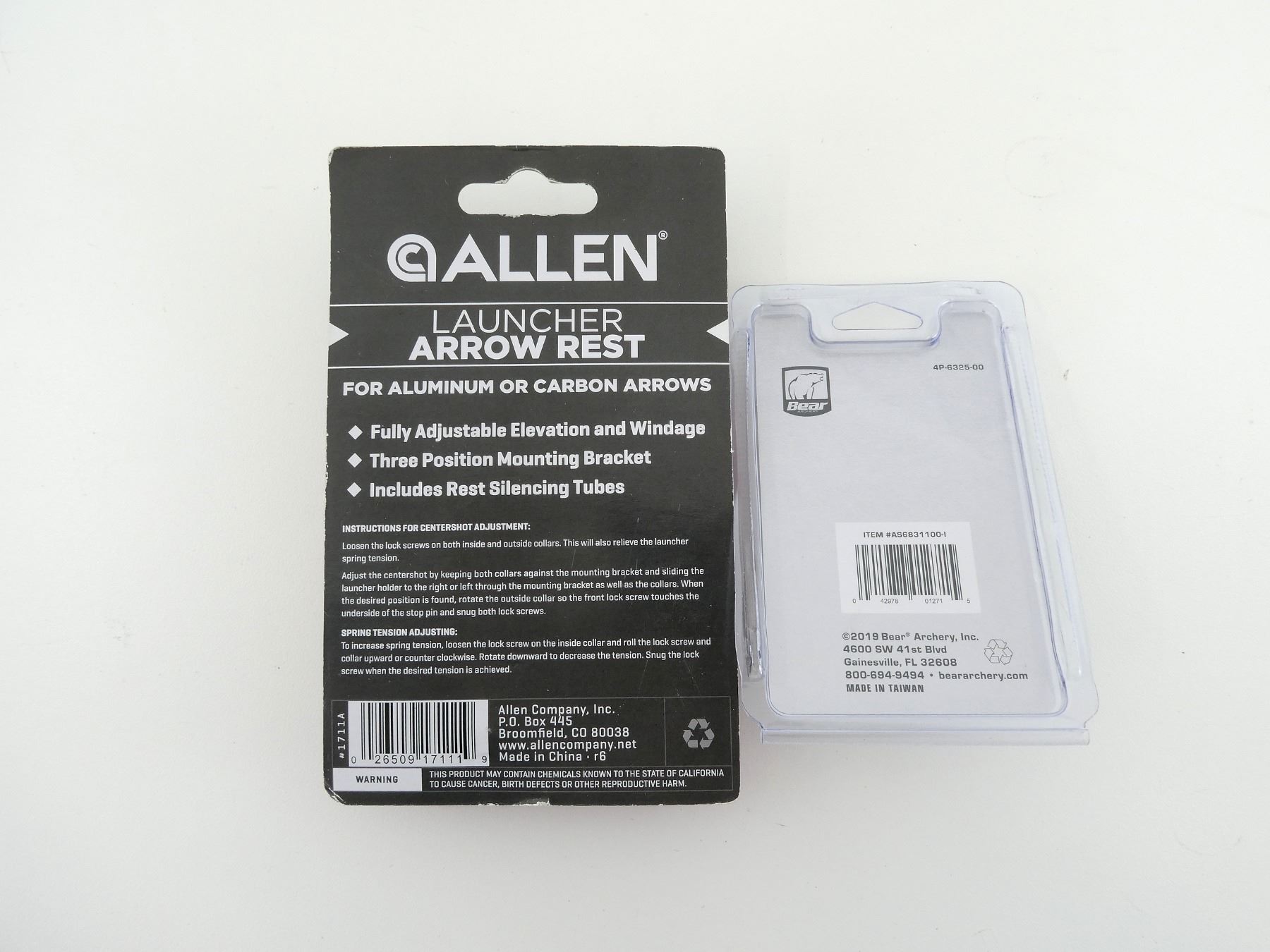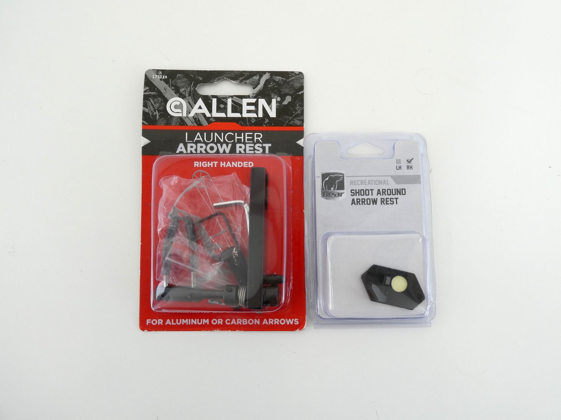 LOT INCLUDES; (1) ALLEN LAUNCHER ARROW REST, RH, FOR ALUMINUM OR CARBON, (1) BEAR SHOOT AROUND ARROW REST, RH, NEW OLD STOCK, UNOPENED, SEE PHOTOS.