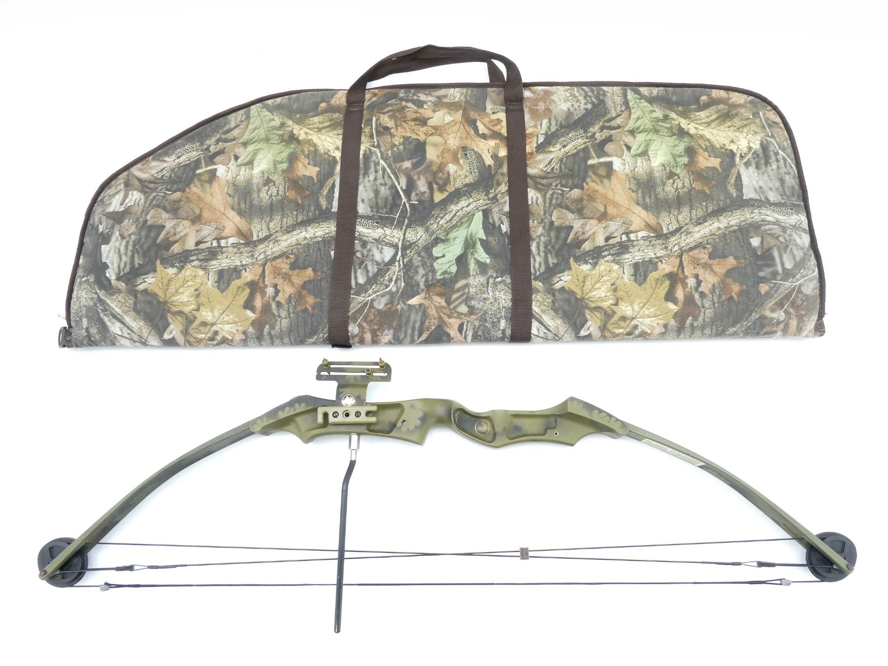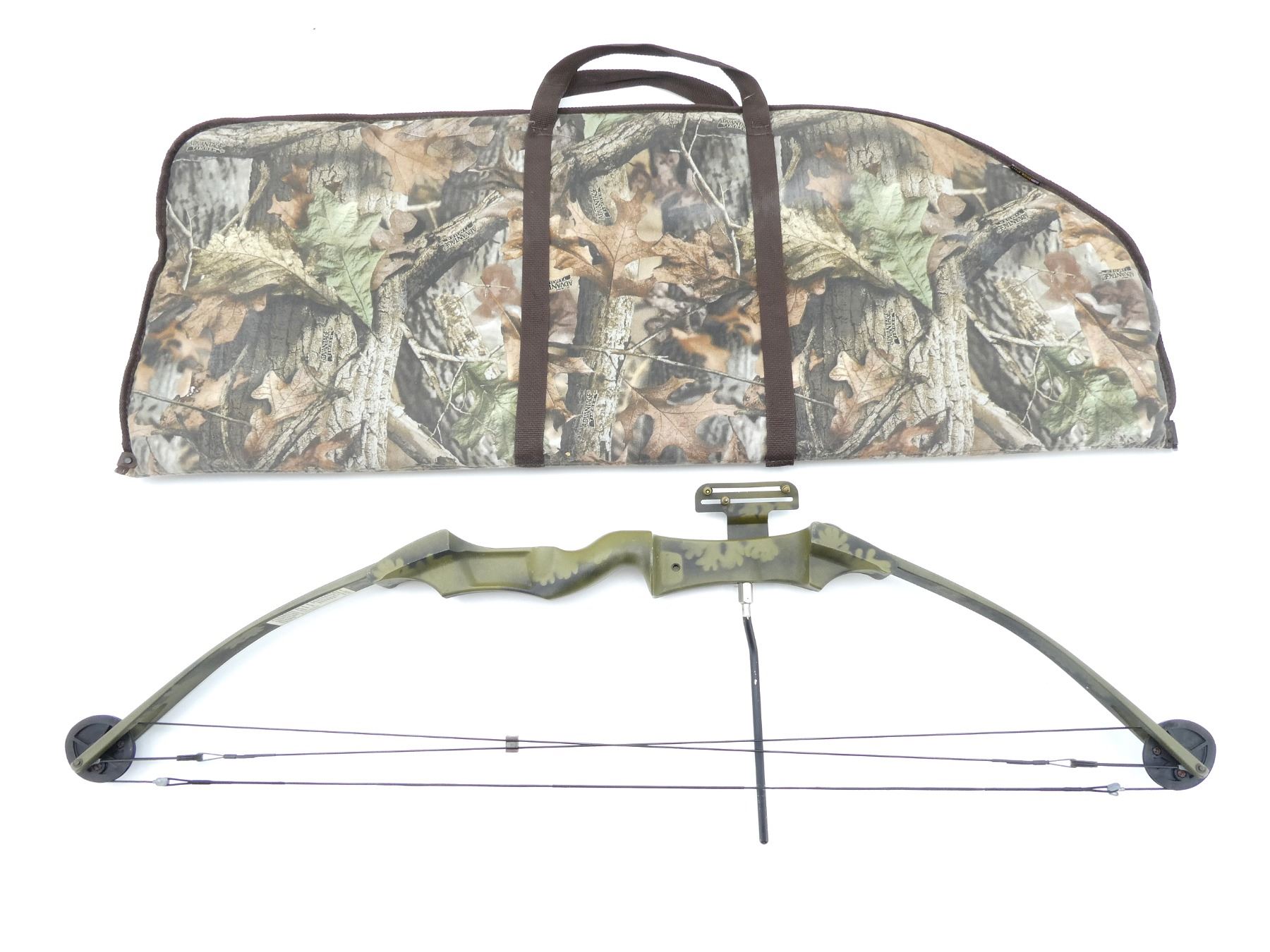 LOT INCLUDES; (1) BEAR WHITETAIL II RIGHT HAND COMPOUND BOW, CAMO, APPROX. DRAW LENGTH 30", APPROX. DRAW WEIGHT 60#, APPROX. AMO COMPOUND STRING LENGTH 38", (3) PIN SIGHTS, (1) SOFT PADDED BOW CASE, ZIPPERED, CARRY HANDLES, APPROX. OVERALL LENGTH 46", SHOWS WEAR AND TEAR FROM USAGE, SEE PHOTOS.