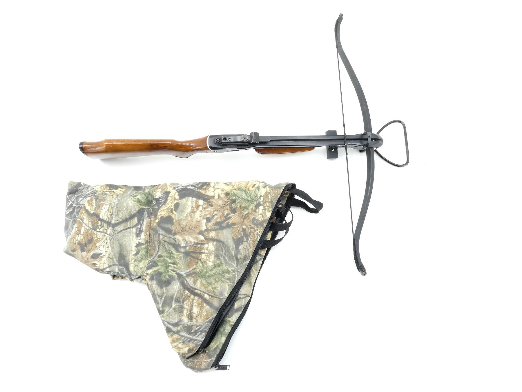 LOT INCLUDES; (1) HOU SHIUEH RECURVE CROSSBOW, UNKNOWN DRAW WEIGHT OR SPEED, WOODEN STOCK, STRING, OPEN SIGHT, APPROX. OVERALL LENGTH 34", (1) CAMO NON-PADDED BOW CASE, CARRY HANDLE & SHOULDER STRAPS, SHOWS WEAR AND TEAR FROM USAGE, SEE PHOTOS.