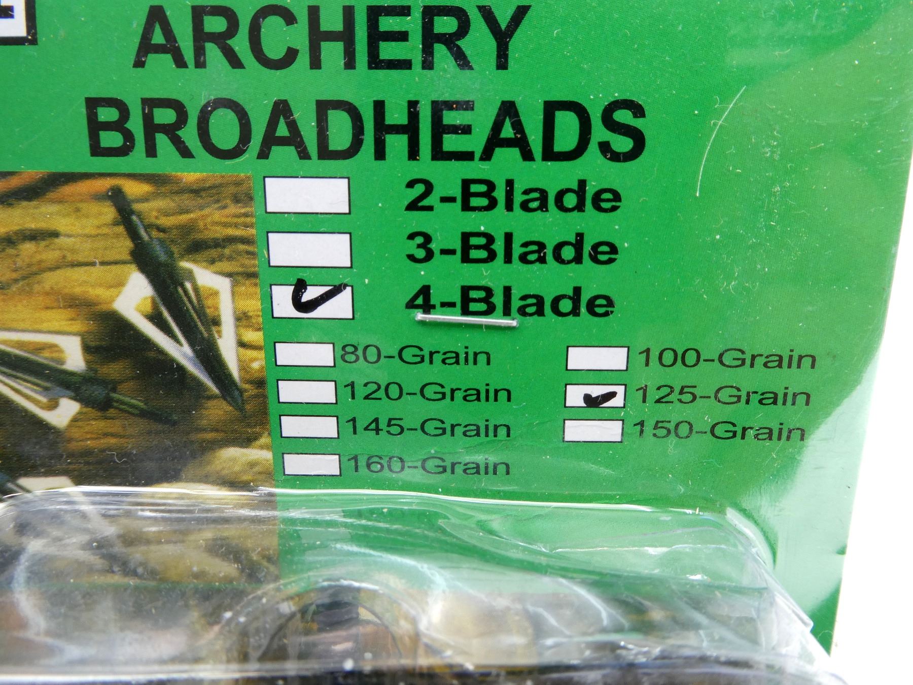 LOT INCLUDES; (6) FIXED BLADE BROADHEADS, (4) BLADE, 125 GRNS (STATED ON PKGS NOT CONFIRMED), 1 3/16' CUTTING DIA, UNOPENED.