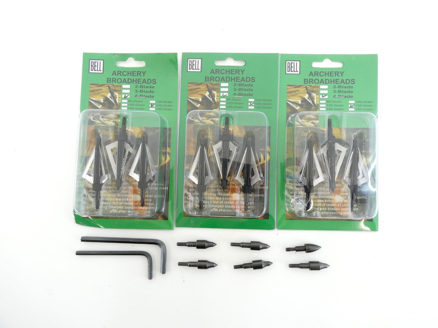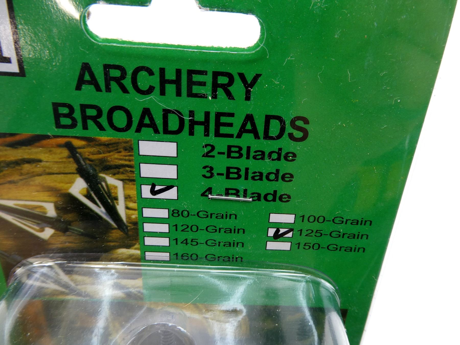 LOT INCLUDES; (6) FIXED BLADE BROADHEADS, (4) BLADE, 125 GRNS (STATED ON PKGS NOT CONFIRMED), 1 3/16' CUTTING DIA, (2) FIXED BLADE BROADHEADS, (3) BLADE, 100 GRNS (STATED ON PKGS NOT CONFIRMED), 1 3/16' CUTTING DIA, (6) FIELD TIPS, (2) ALLEN KEYS, NON, (2)UNOPENED.