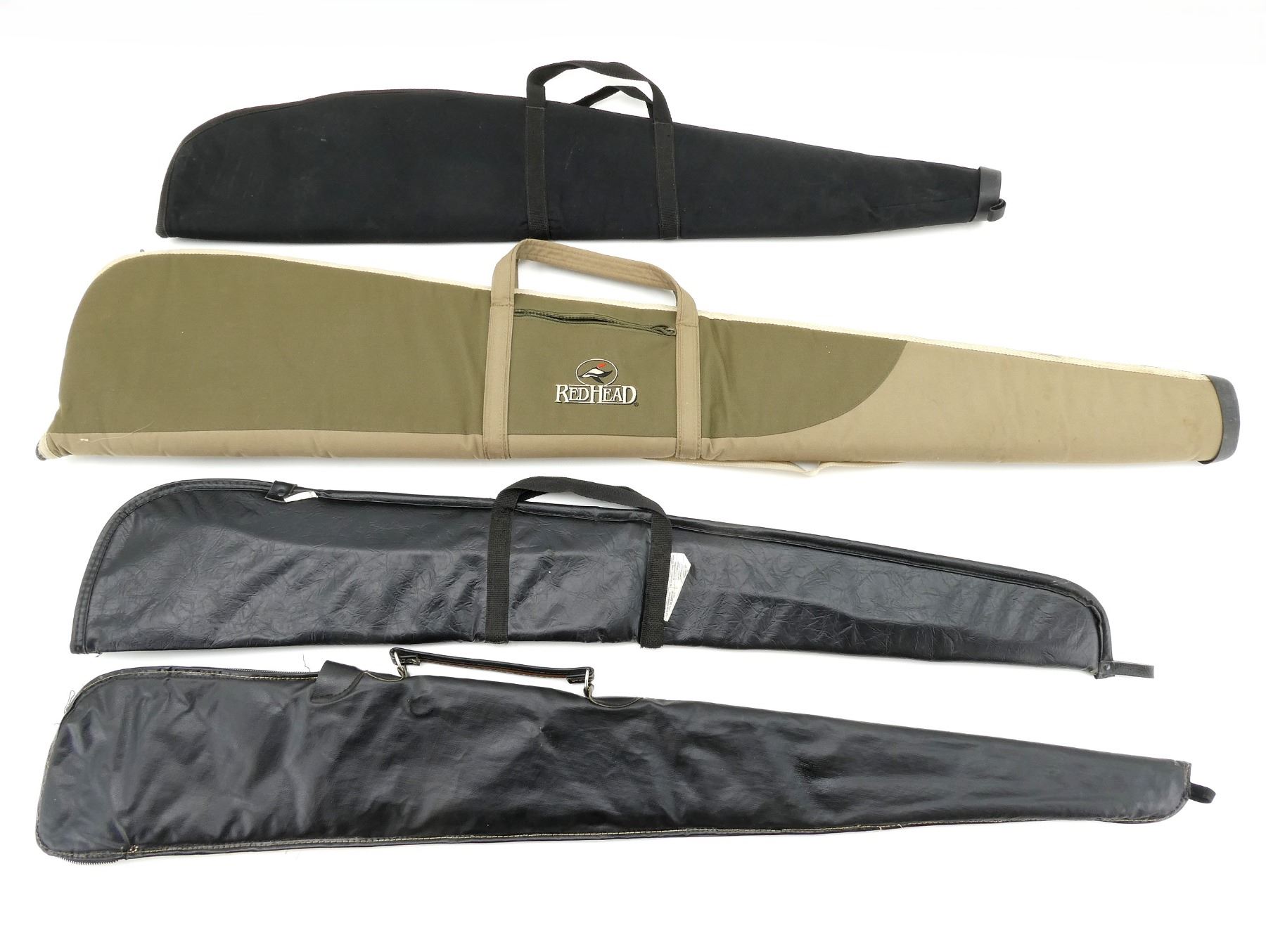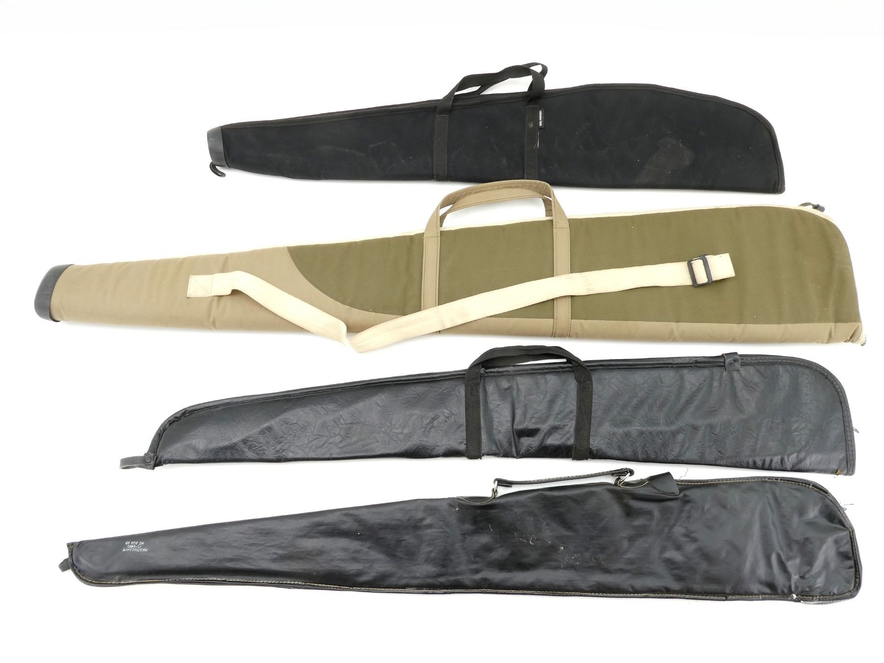 LOT INCLUDES; (4) SOFT PADDED GUN CASES, ZIPPERED, CARRY HANDLES, (1) WITH SHOULDER STRAP & OUTSIDE ZIPPERED POCKET, APPROX. OVERALL LENGTH 40"-53", SHOWS WEAR AND TEAR FROM USAGE, SEE PHOTOS.