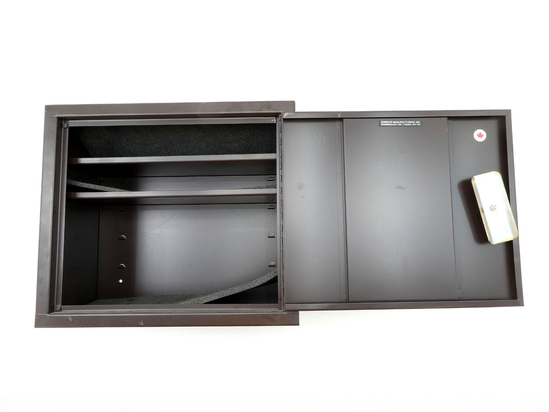 LOT INCLUDES; (1) BROWN METAL GUN CABINET, PADDED, SINGLE LOCK, WITH 1 KEYS, (2) SHELVES WITH FOAM, LIGHT WEAR & TEAR, SEE PHOTOS, APPROX. 21"X10"X18".