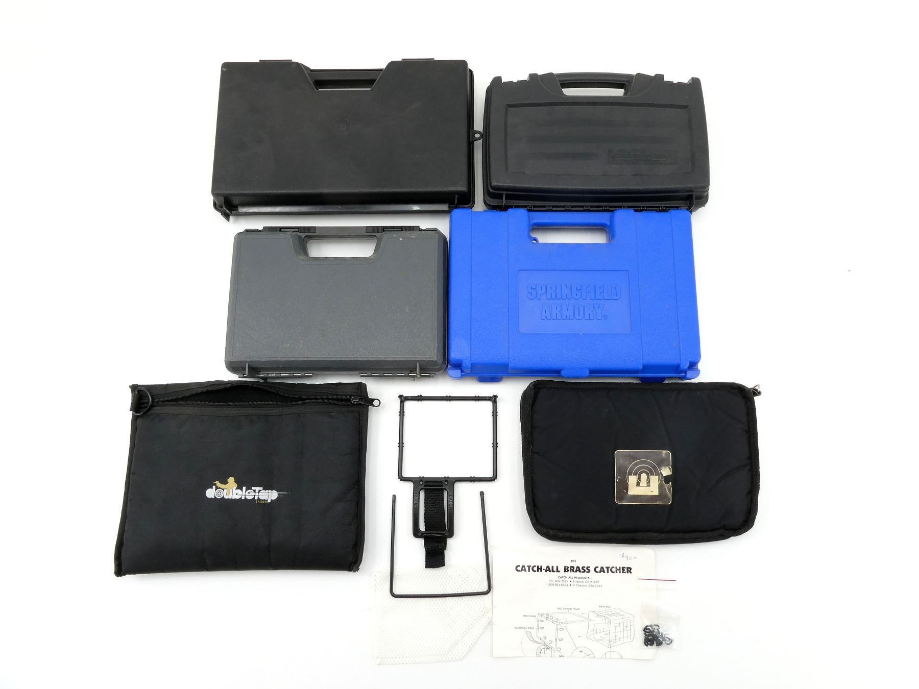 LOT INCLUDES; APPROX. (3) HARD PADDED HAND GUN CASES, CARRY HANDLE, (2) LATCHES, (1) NON-PADDED MOLDED HAND GUN CASE, CARRY HANDLE, POSSIBLY FOR A M1911-A1 .45 TROPHY MATCH PISTOL, (2) LATCHES, (1) SOFT PADDED HAND GUN CASE, ZIPPERED, (1) CATCH-ALL BRASS CATCHER, APPROX. OVERALL LENGTH 11"-14", LIGHT WEAR & TEAR, SEE PHOTOS, APPROX. 21"X10"X18".