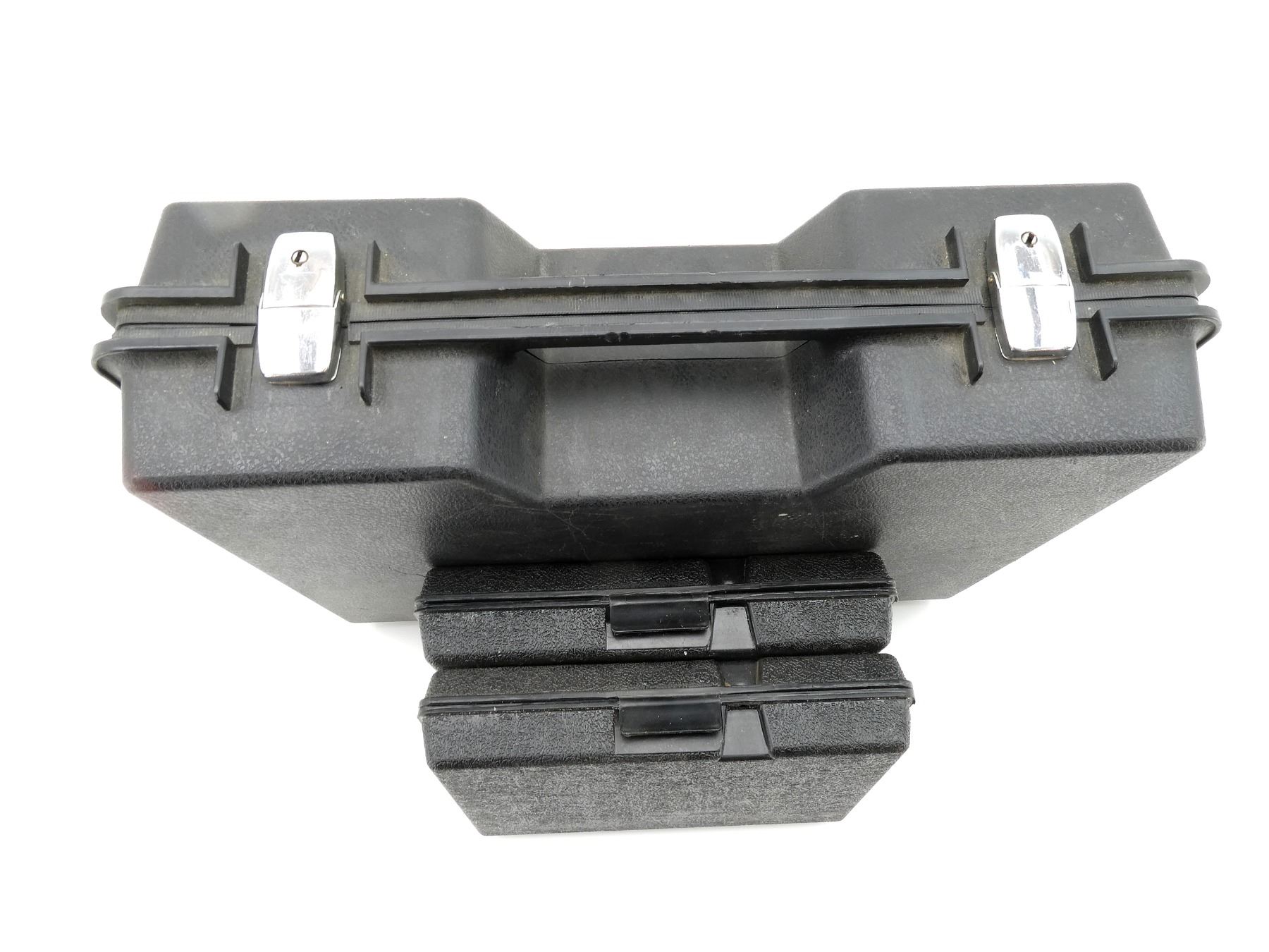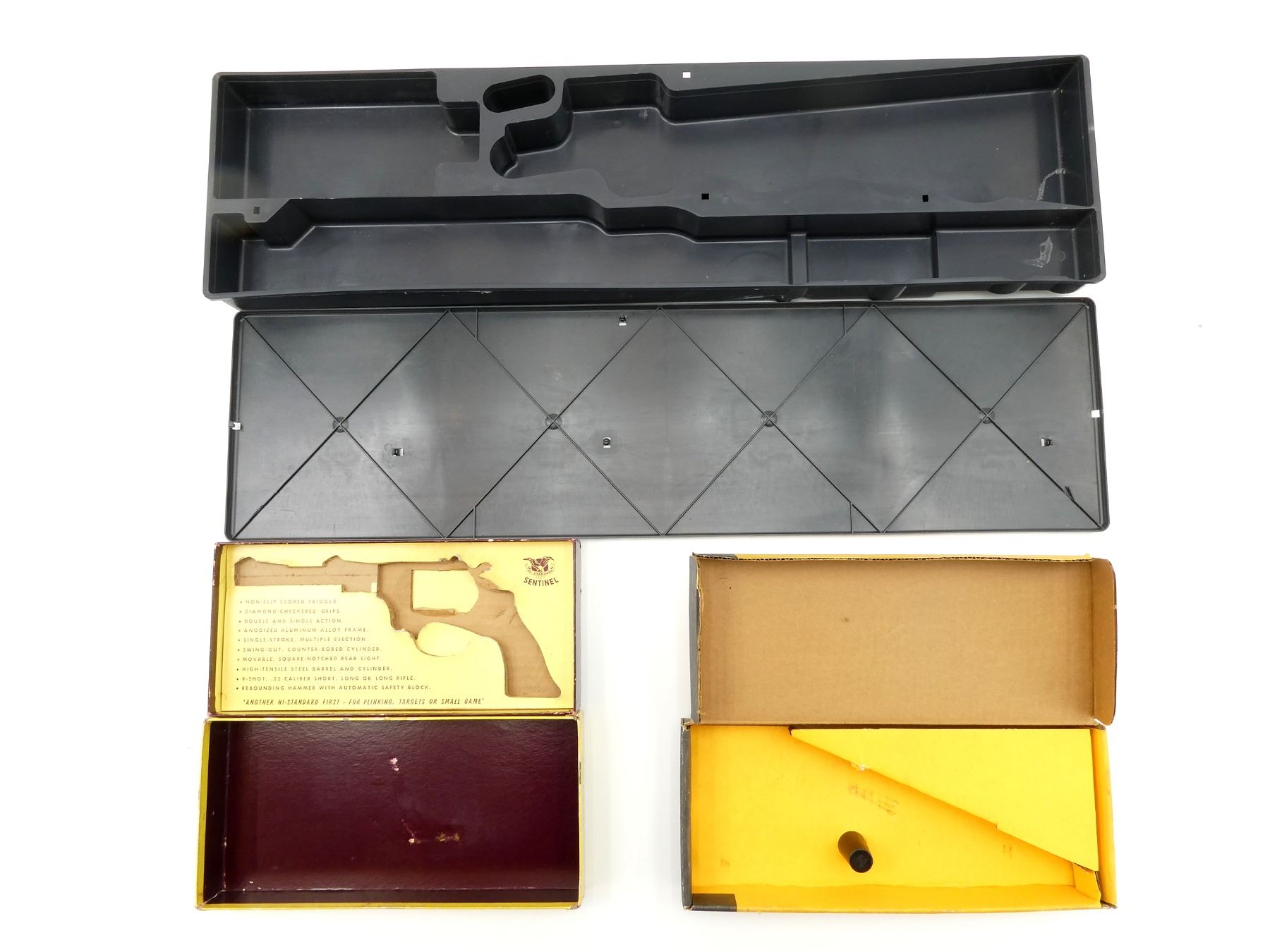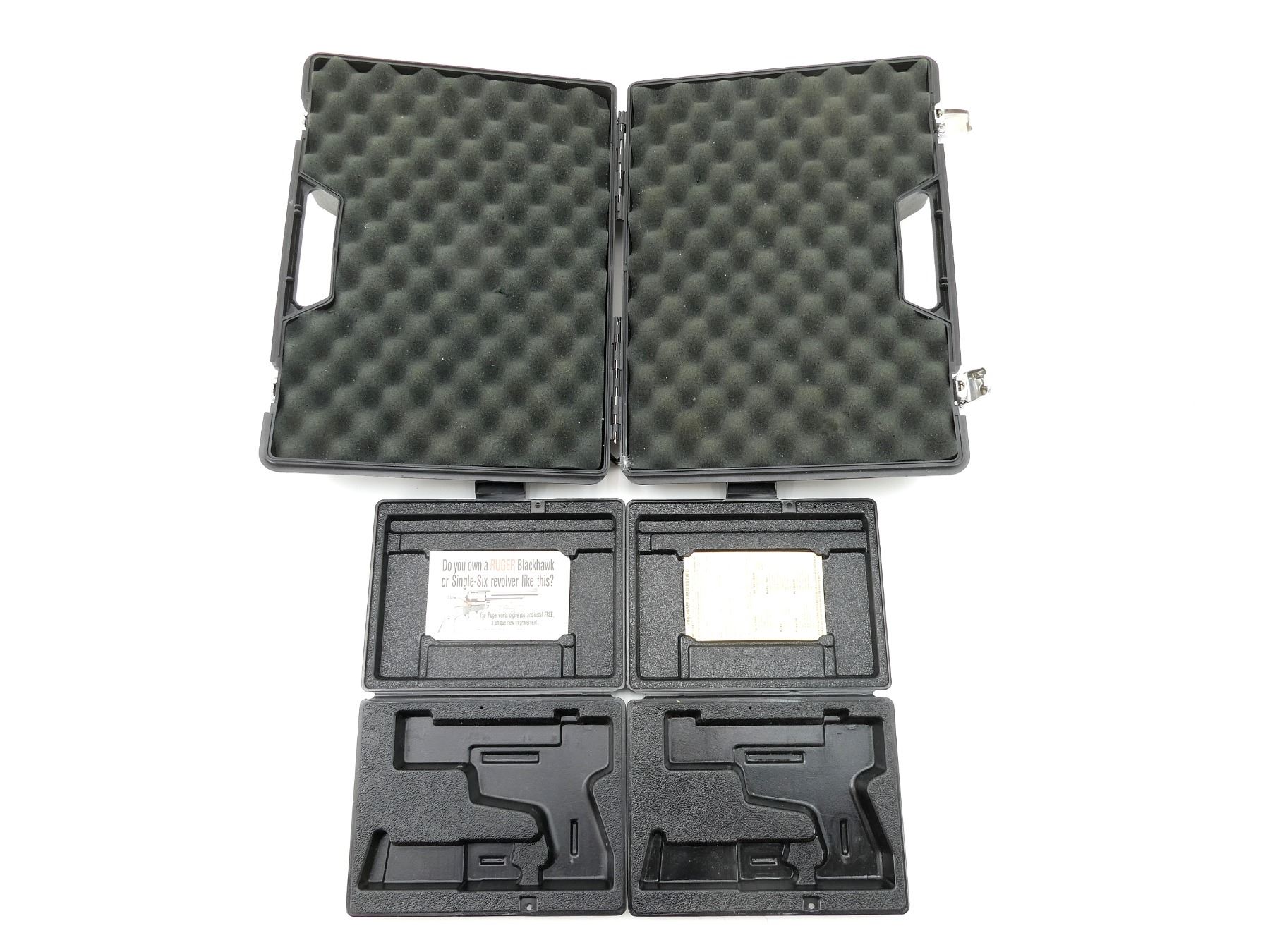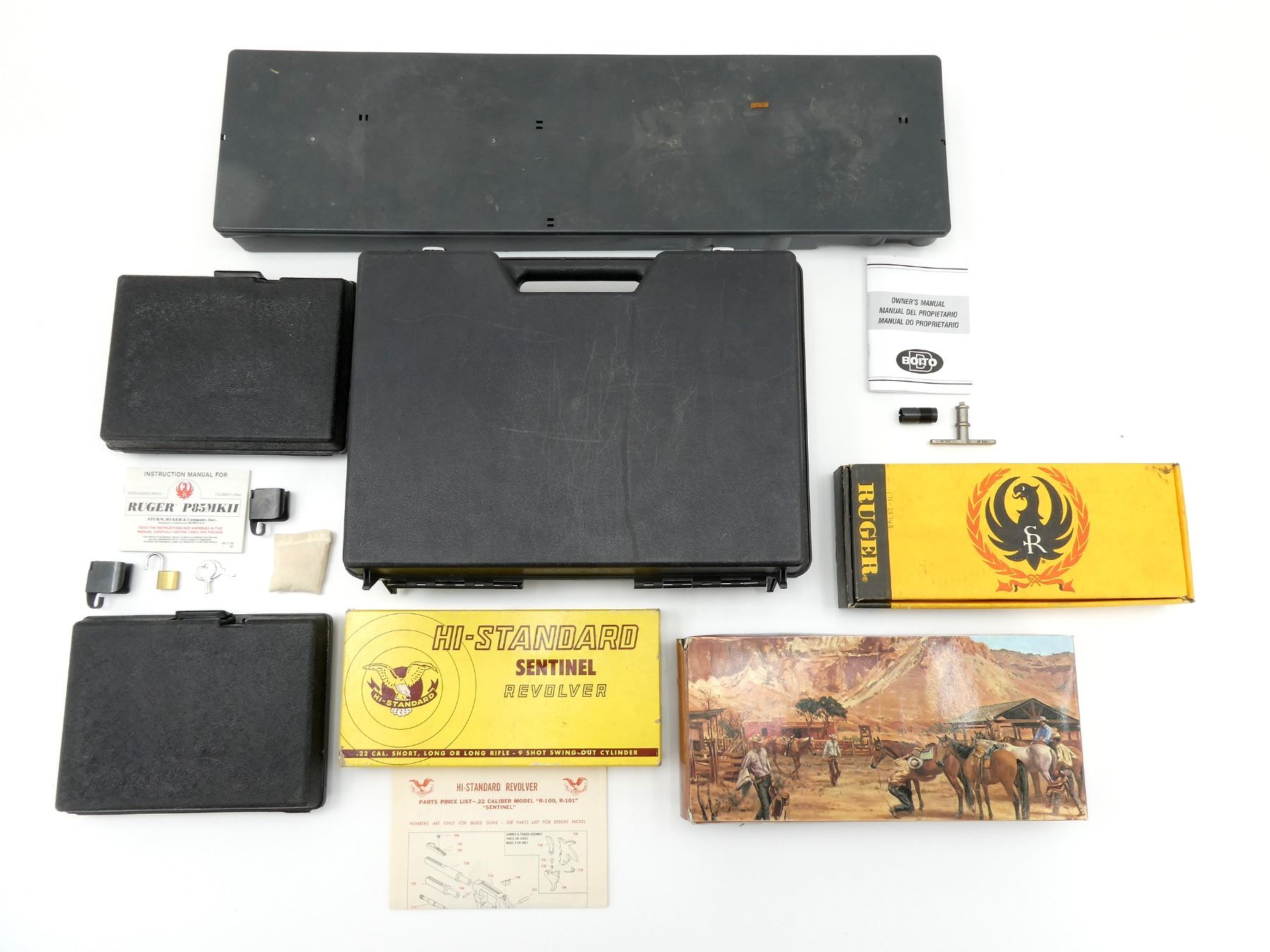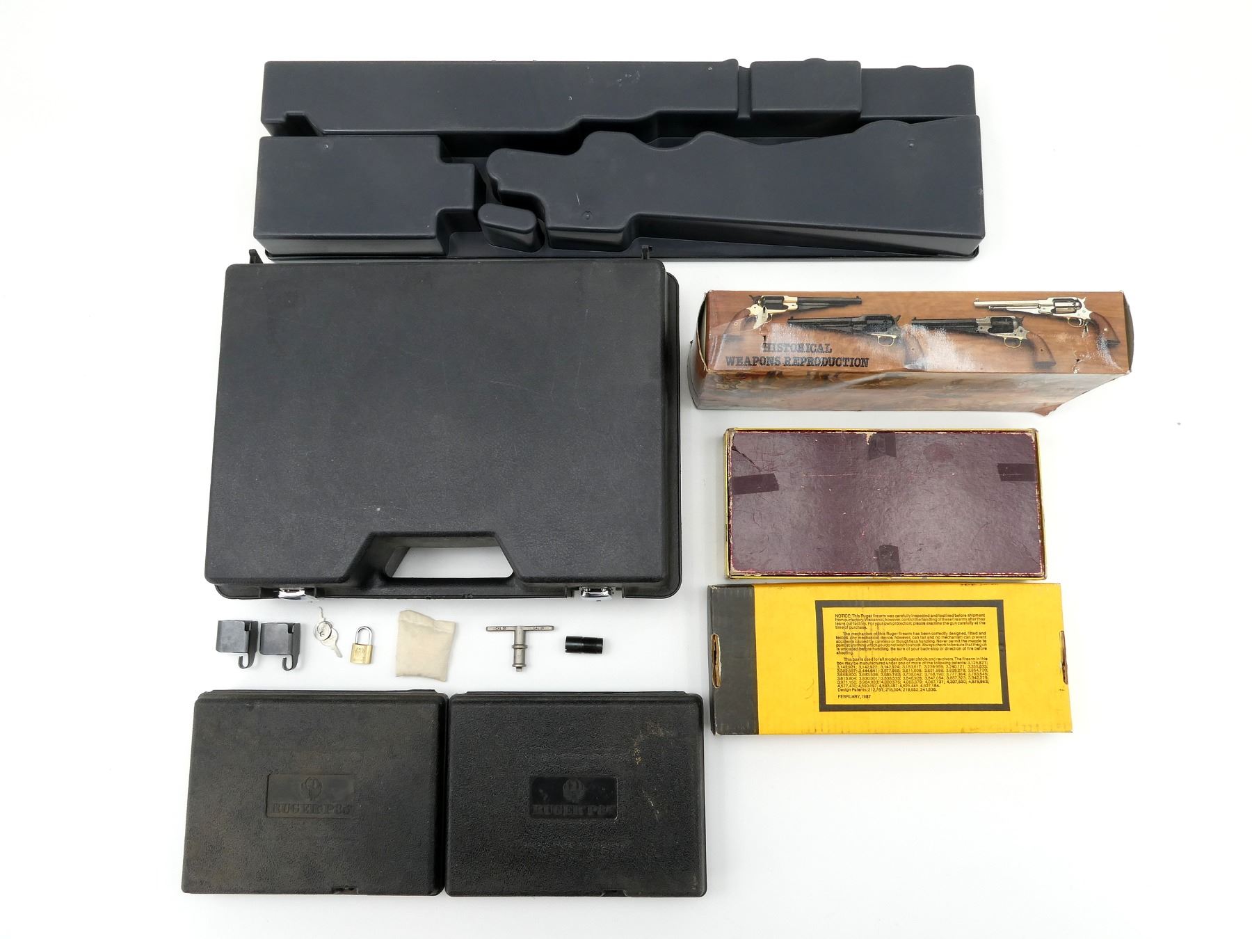 LOT INCLUDES; (1) RUGER HANDGUN BOX, (1) BOITO TAKEDOWN SHOT GUN PLASTIC FORMED CASE, OWNERS MANUAL, CHOKE, CHOKE WRENCH , (2) RUGER P85MKII PLASTIC FORMED GUN CASE, (1) MANUAL, (1) HARD PADDED HAND GUN CASE, CARRY HANDLE, (2) LATCHES, NO KEYS, (1) HI-STANDARD .22 CALIBER REVOLVER EMPTY BOX, (1) HISTORICAL WEAPONS REPRODUCTION REVOLVER EMPTY BOX, ETC., APPROX. OVERALL LENGTH 10"-30", SHOWS WEAR AND TEAR FROM USAGE, SEE PHOTOS.