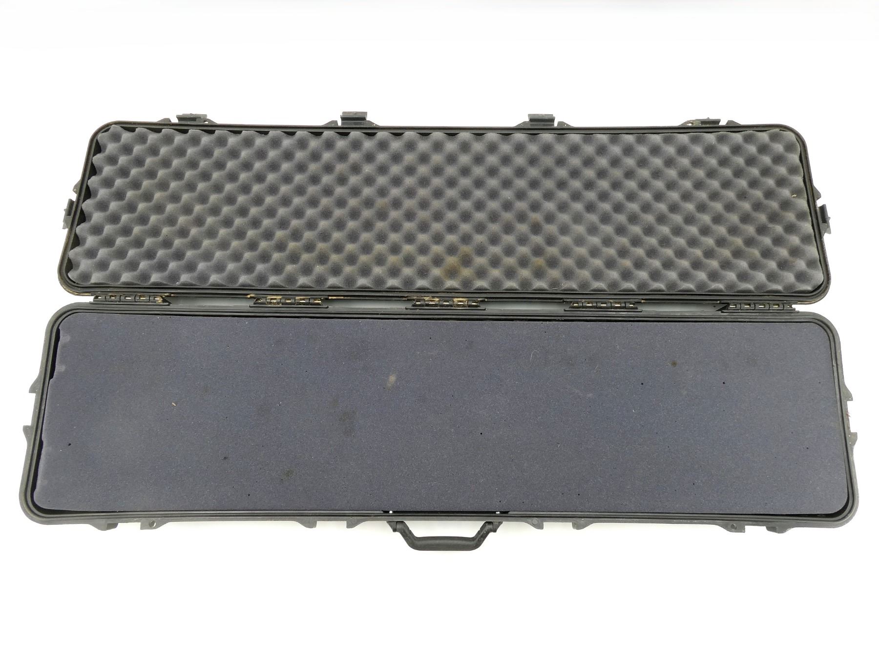 LOT INCLUDES; (1) BLACK CASE GARD HARD PADDED DOUBLE RIFLE CASE, CARRY HANDLE, DRAG HANDLE, (5) LATCHES, (2) WHEELS, (1) PRESSURE CONTROL VALVE, APPROX. OVERALL LENGTH 51", SHOWS WEAR AND TEAR FROM USAGE, SEE PHOTOS
