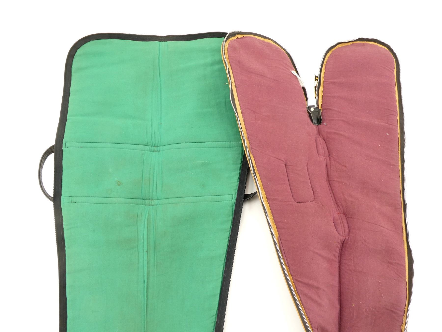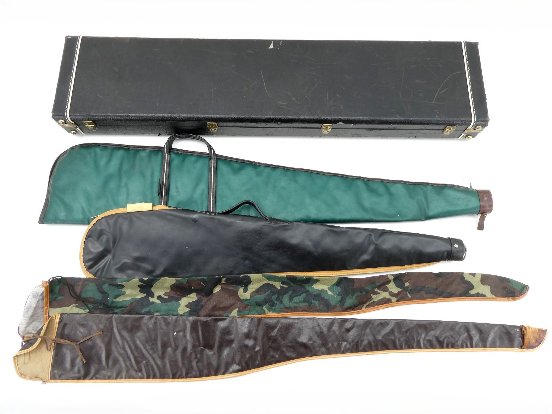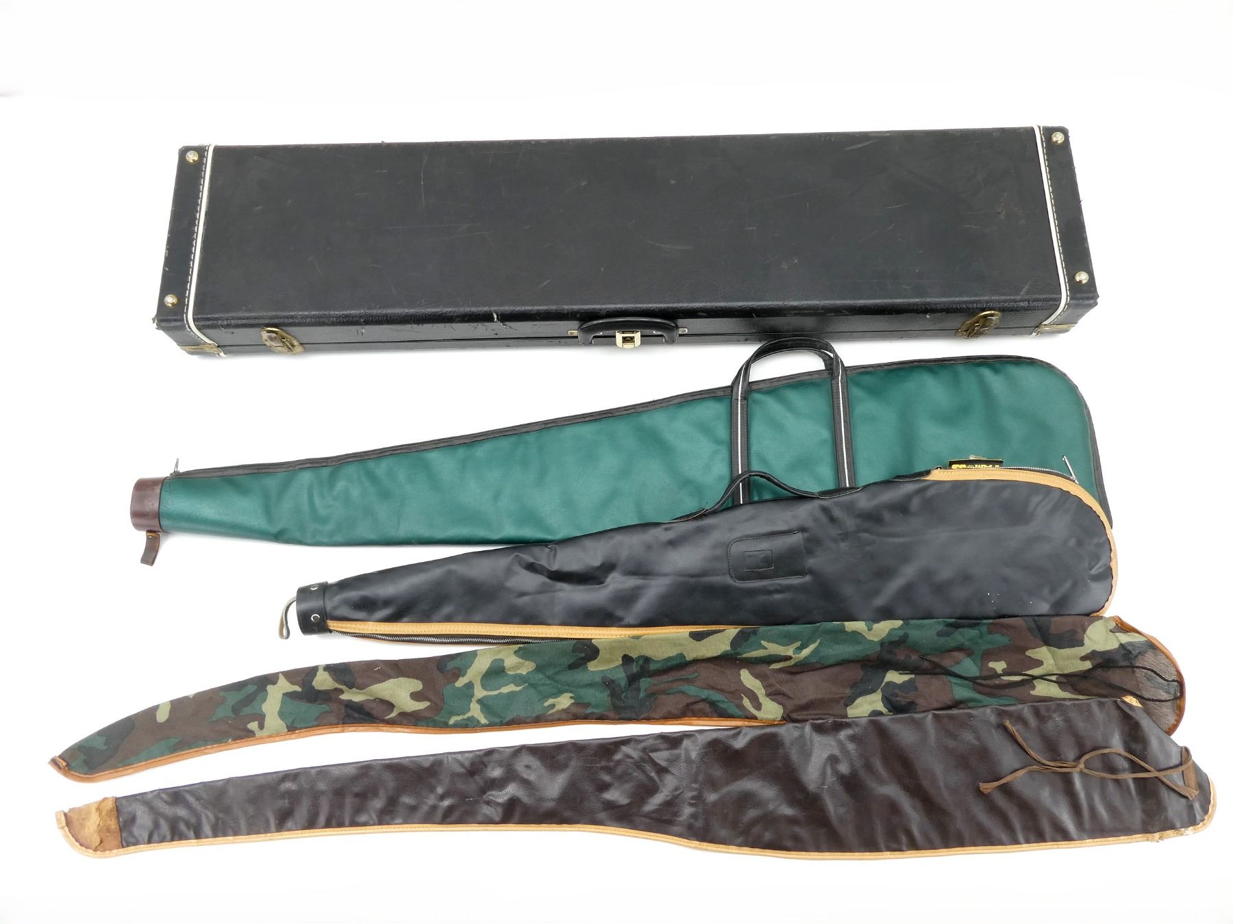 LOT INCLUDES; (1) BLACK HARD PADDED GUN CASE, CARRY HANDLE, (3) LATCHES, (2) SOFT PADDED GUN CASES, CARRY HANDLES, ZIPPERED; (2) NON-PADDED SIDE IN GUN CASES, WITH TIE STRAPS, (1) IS DAMAGED, APPROX. OVERALL LENGTH 40"-51", SHOWS WEAR AND TEAR FROM USAGE, SEE PHOTOS