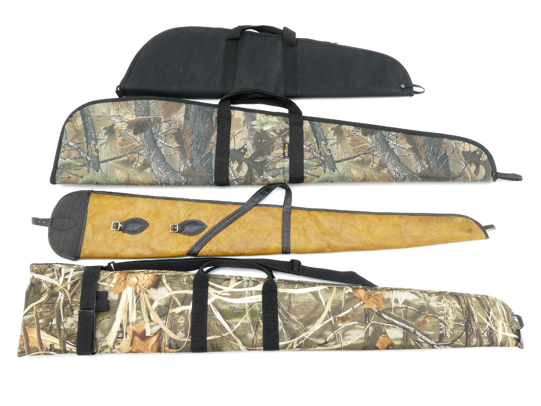 LOT INCLUDES; (4) SOFT PADDED GUN CASES, ZIPPERED, CARRY HANDLES, (1) HAS SHOULDER STRAP & OUTSIDE VELCRO POCKET, (1) HAS STRAP & BUCKEL STRAP IS BROKEN, APPROX. OVERALL LENGTH 32"-46", SHOWS WEAR AND TEAR FROM USAGE, SEE PHOTOS.