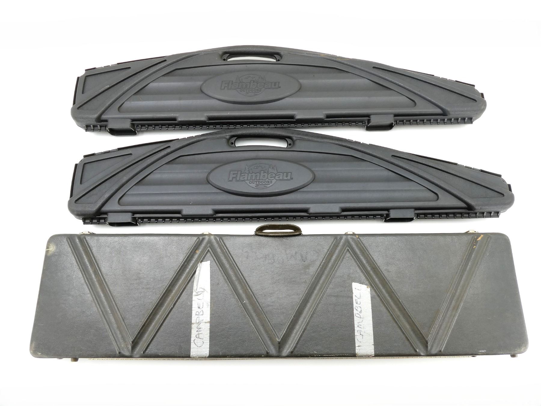 LOT INCLUDES; (3) HARD PADDED GUN CASES, CARRY HANDLES, (4) LATCHES, (2) ARE LOCKING WITH NO KEYS, APPROX. OVERALL LENGTH 50"-51", SHOWS WEAR AND TEAR FROM USAGE, SEE PHOTOS.