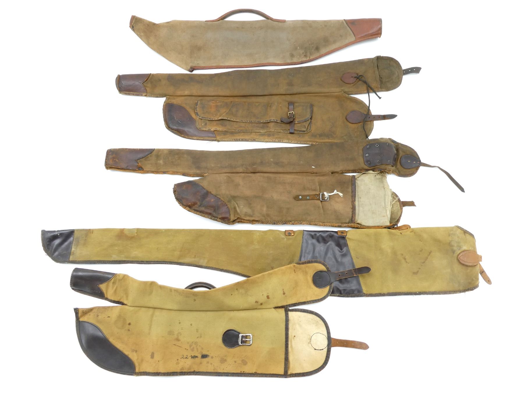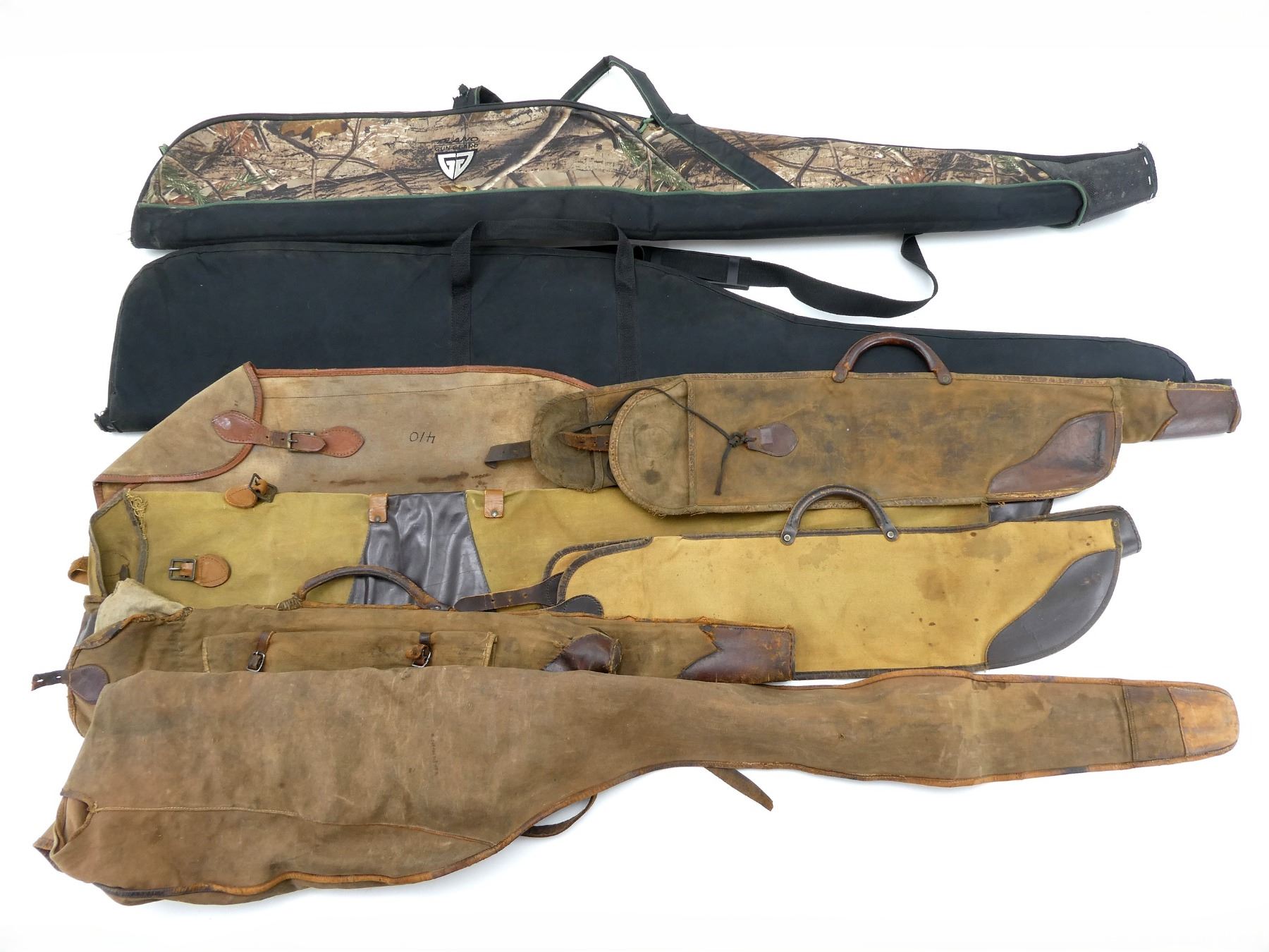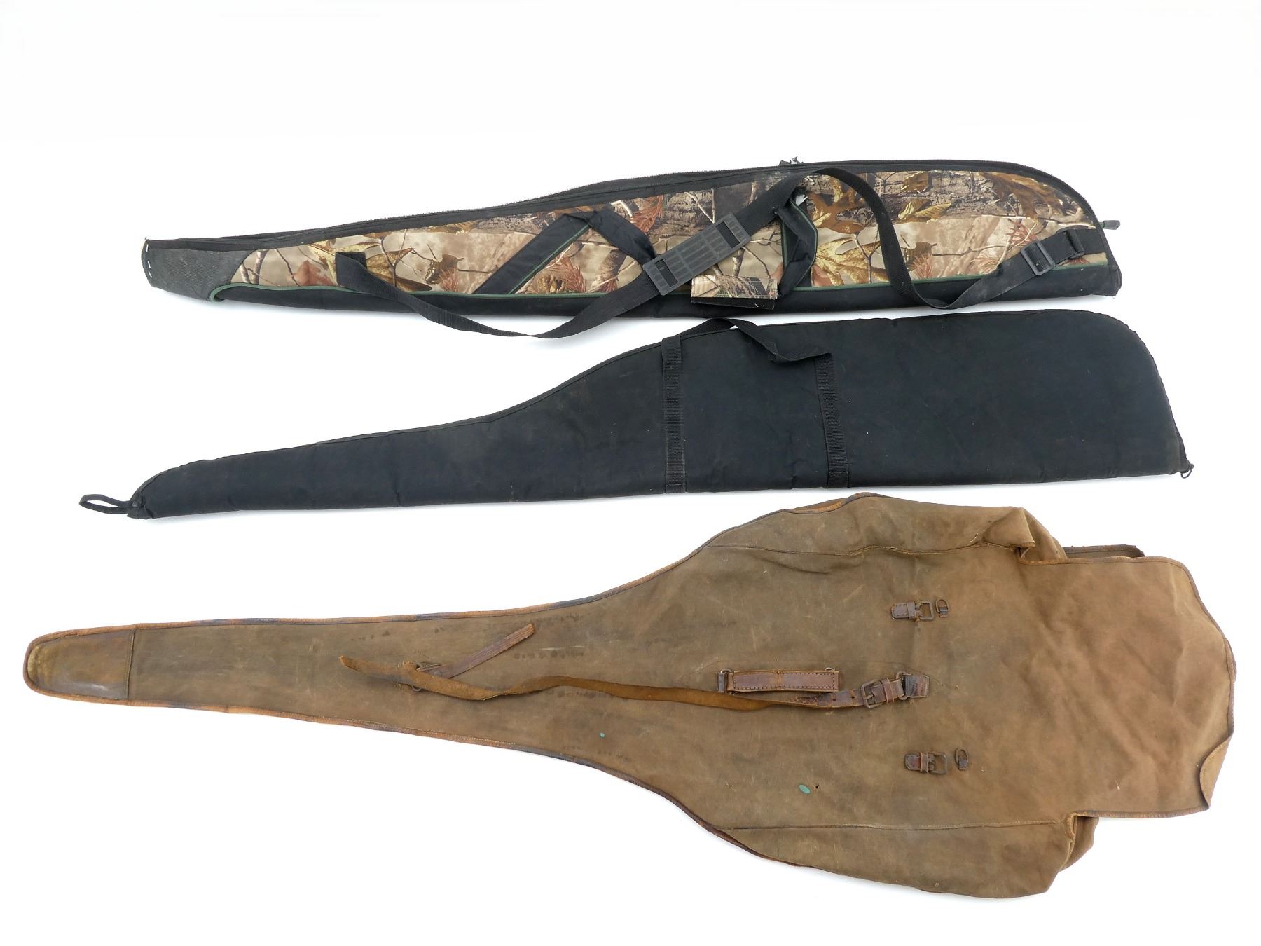 LOT INCLUDES; APPROX. (2) SOFT PADDED GUN CASES, CARRY HANDLES, ZIPPERED, (1) IS MISSING ZIPPER AND RIPPED, (2) NON-PADDED GUN CASES, (10 WITH CARRY HANDLE, LEATHER STRAPS & BUCKELS, (4) TAKE DOWN GUN CASES, CARRY HANDLES, LEATHER STRAPS & BUCKLES, (1) IS MISSING LEATHER STRAP, APPROX 0AL 31"-52", SHOWS WEAR AND TEAR FROM USAGE, SEE PHOTOS.