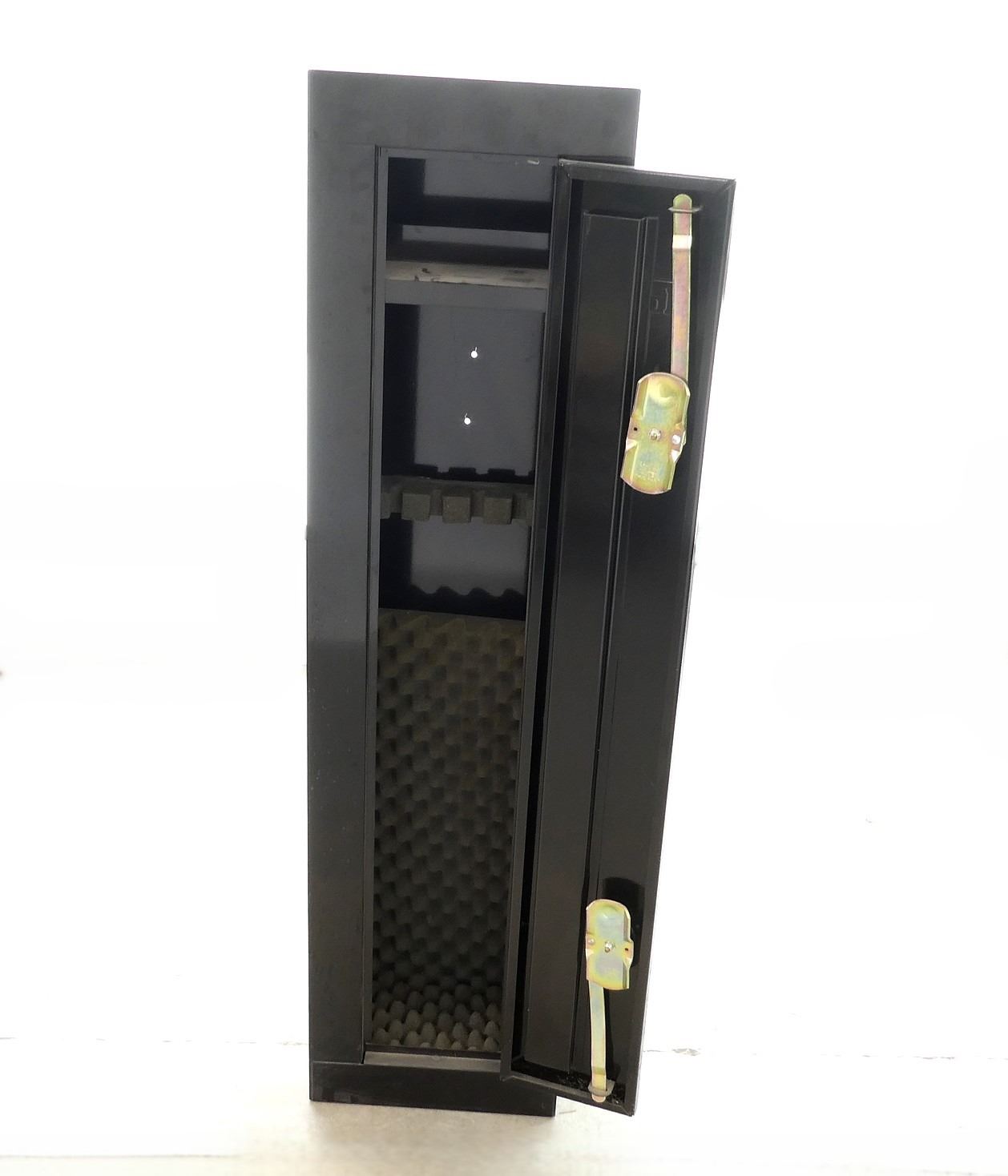 LOT INCLUDES; (1) BLACK METAL GUN CABINET, DOUBLE LOCK, WITH 2 KEYS, FOAM BARREL RESTS & BOTTOM FOAM PADDING, (1) SHELF, APPROX. 14"X10"X55 1/4", LIGHT WEAR & TEAR, SEE PHOTOS,*PICK UP ONLY, NO SHIPPING*.