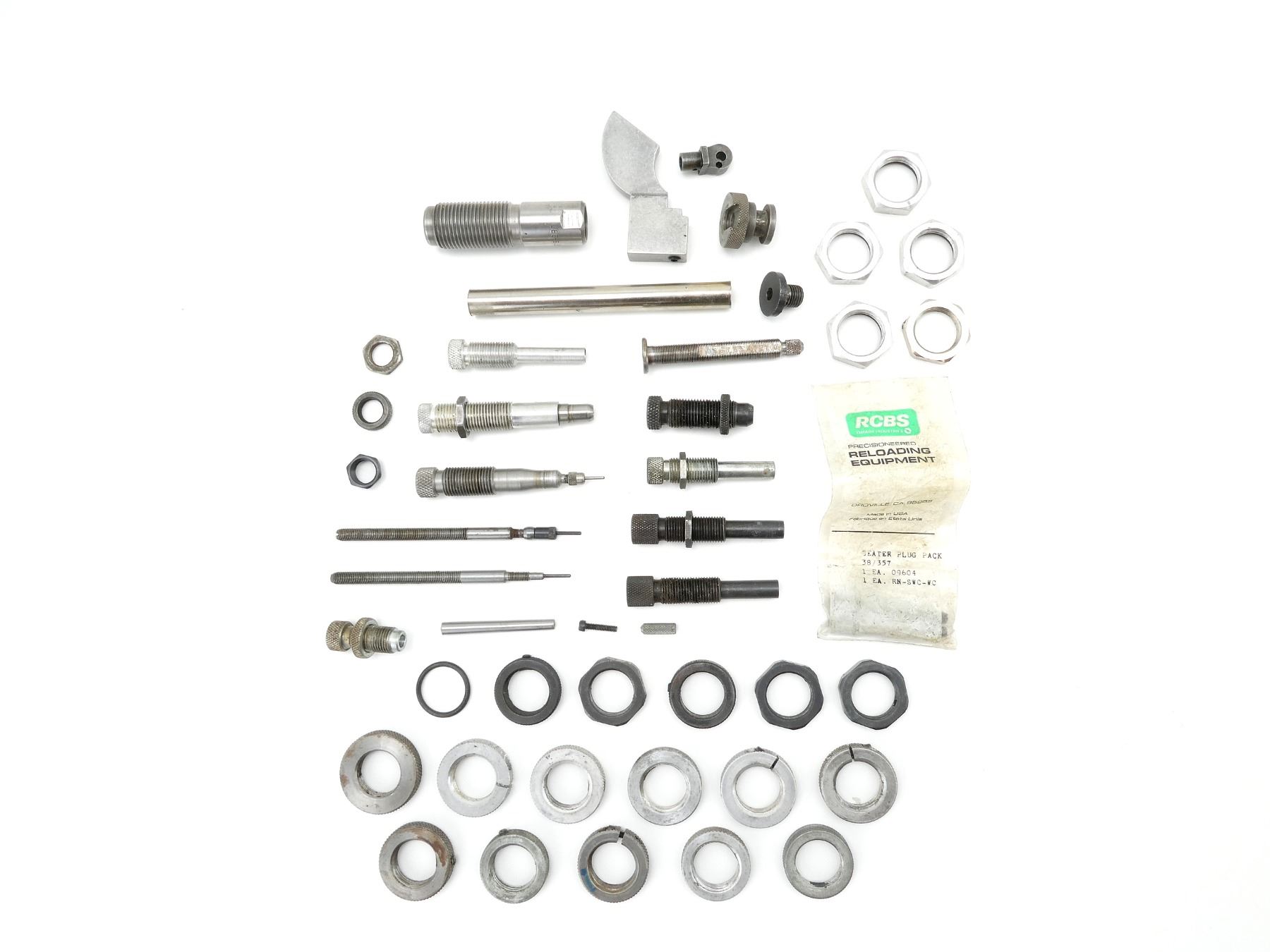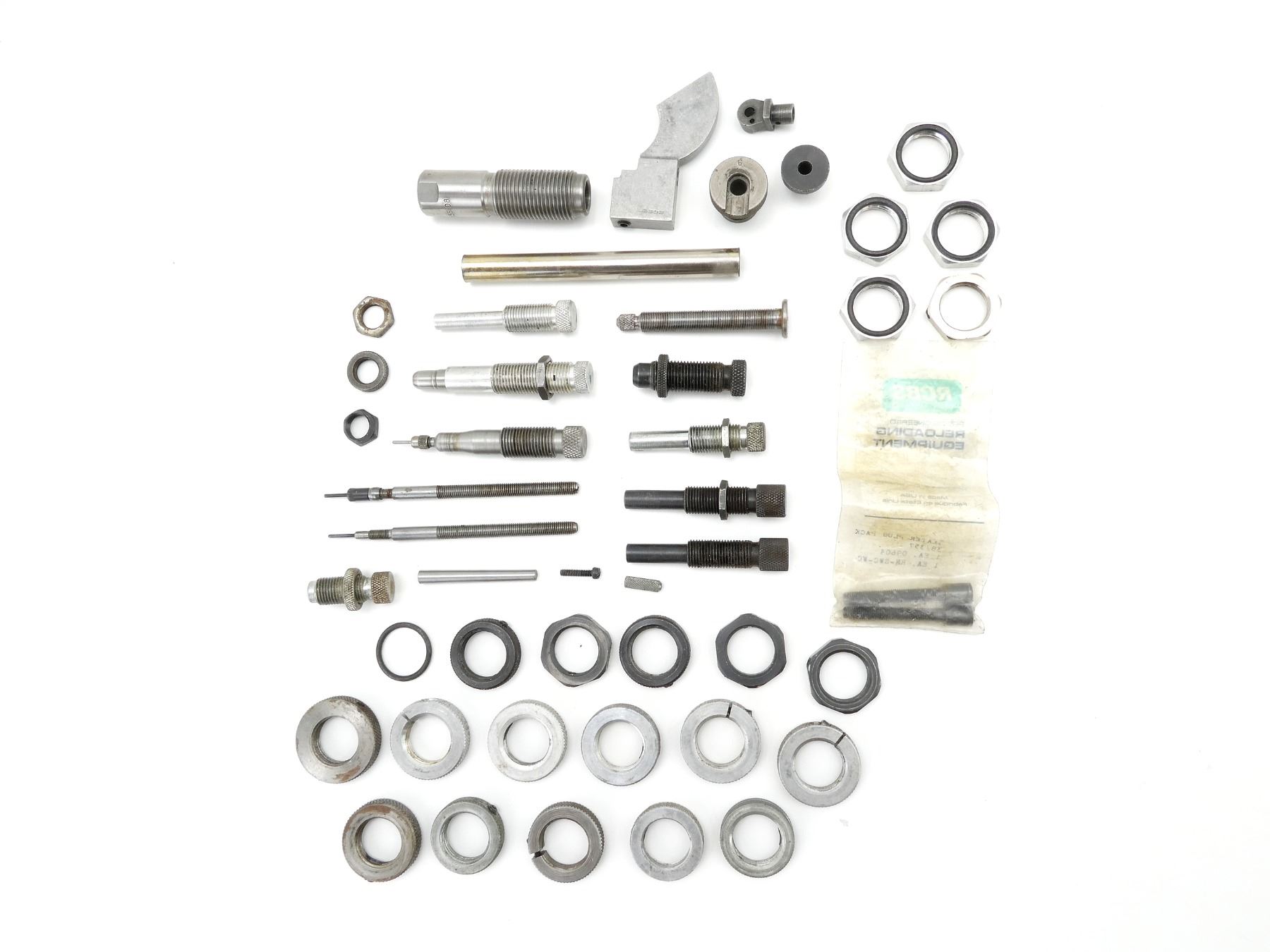 LOT INCLUDES; APPROX. (24) ASSORTED LOCKING RINGS, VARIOUS SHAPES / SIZES, (1) RCBS .38/357 SEATER PLUG PACK, (11) RELOADING DIE PIECES / ATTACHMENTS, VARIOUS MARKINGS / CALIBERS, (1) #6 SHELL HOLDER, (1) LEE 6.5X55MM RELOADING DIE, ETC. SEE PHOTOS.