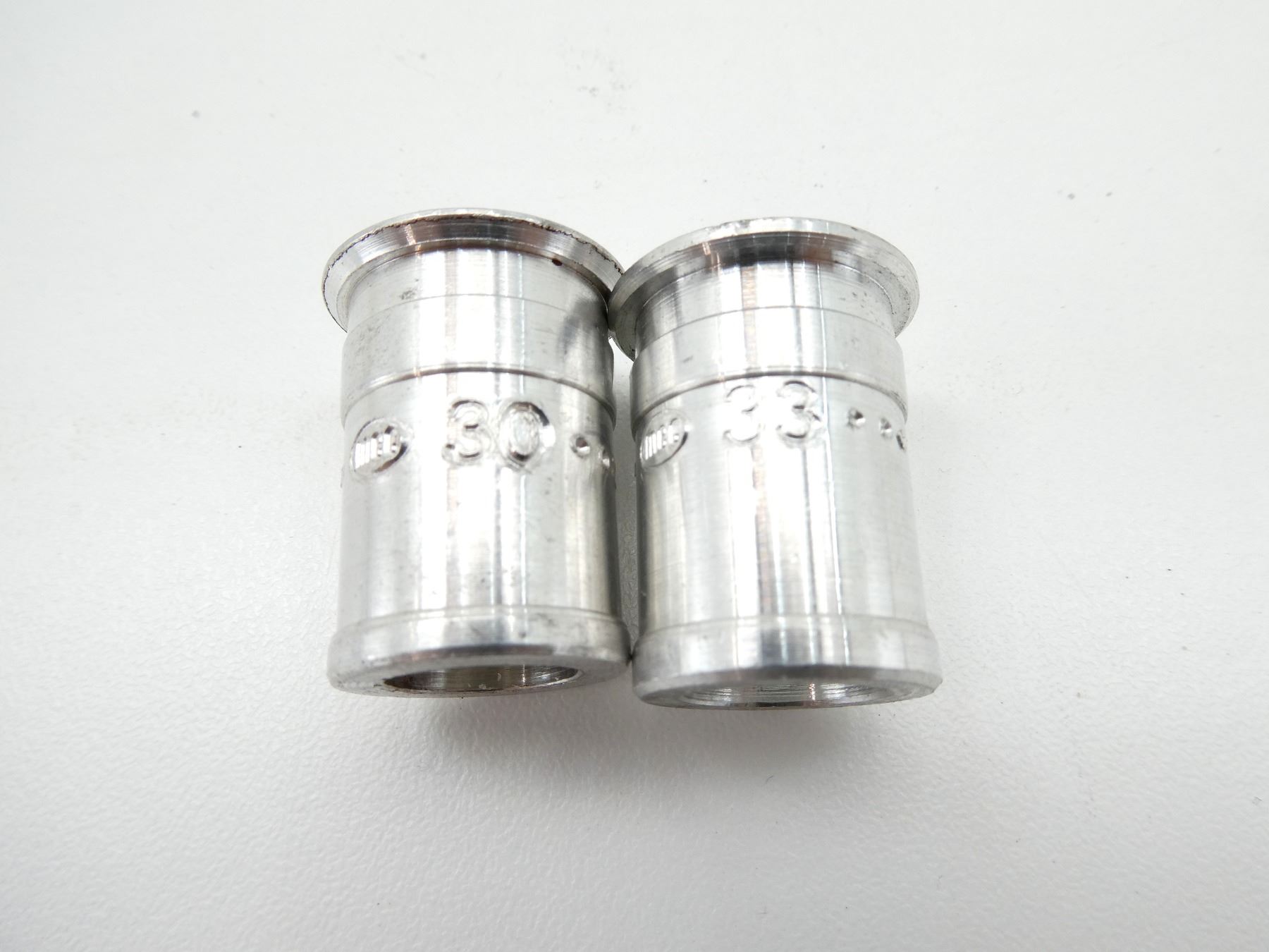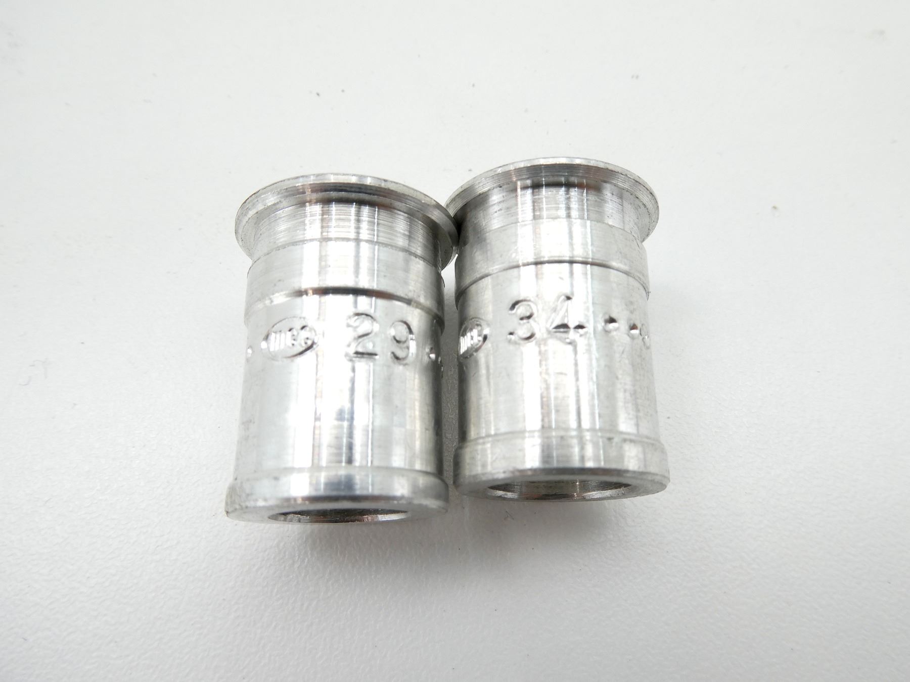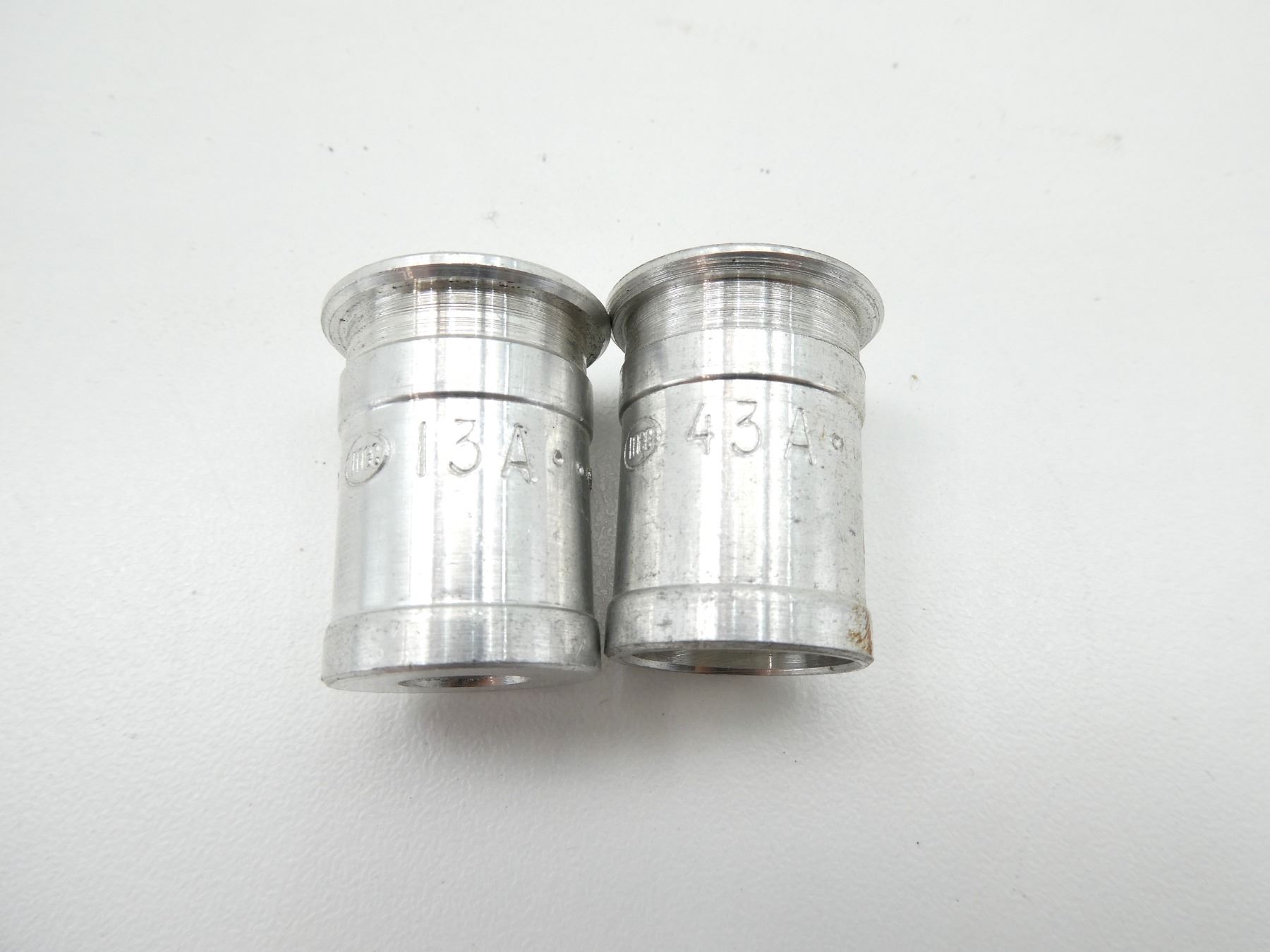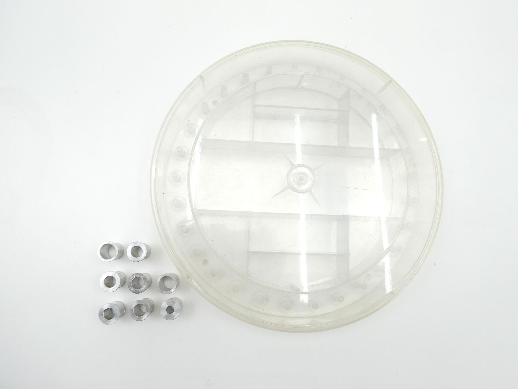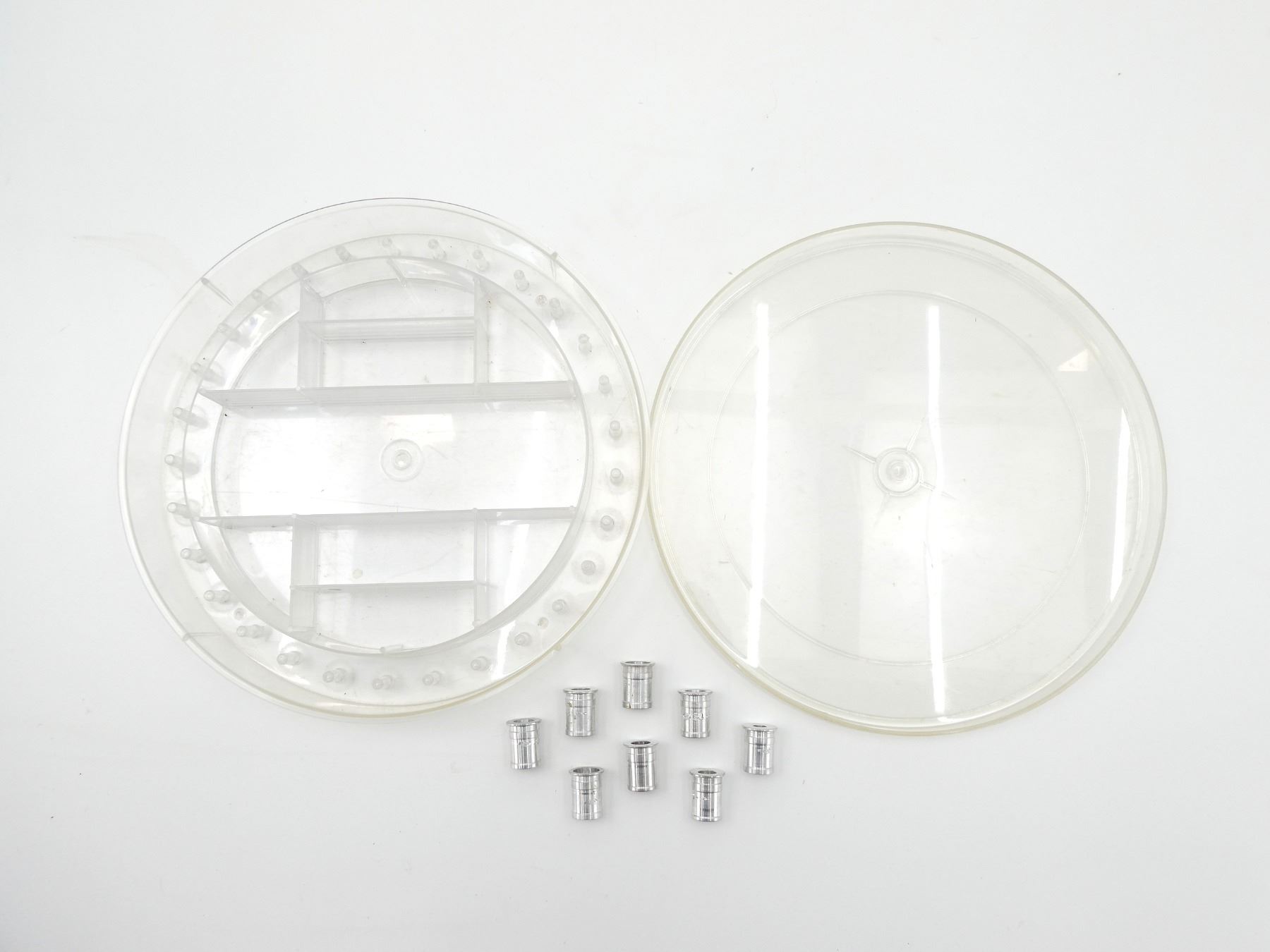 APPROX. (8) ASSORTED POWDER BUSHINGS, INCLUDING; #13A, #29, #30, #31, #33, #34, #43A, #44 & (1) CLEAR PLASTIC HOLDER / TRAY WITH LID, APPROX. 11.5" DIA. SEE PHOTOS.