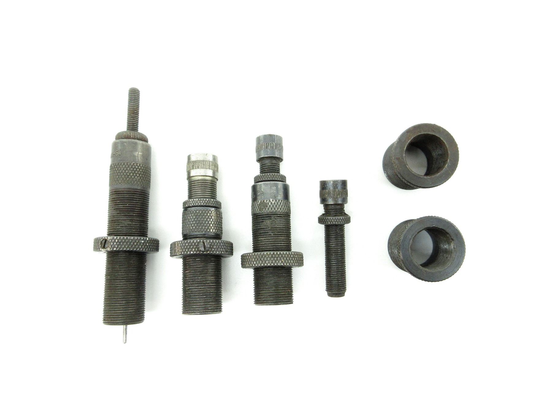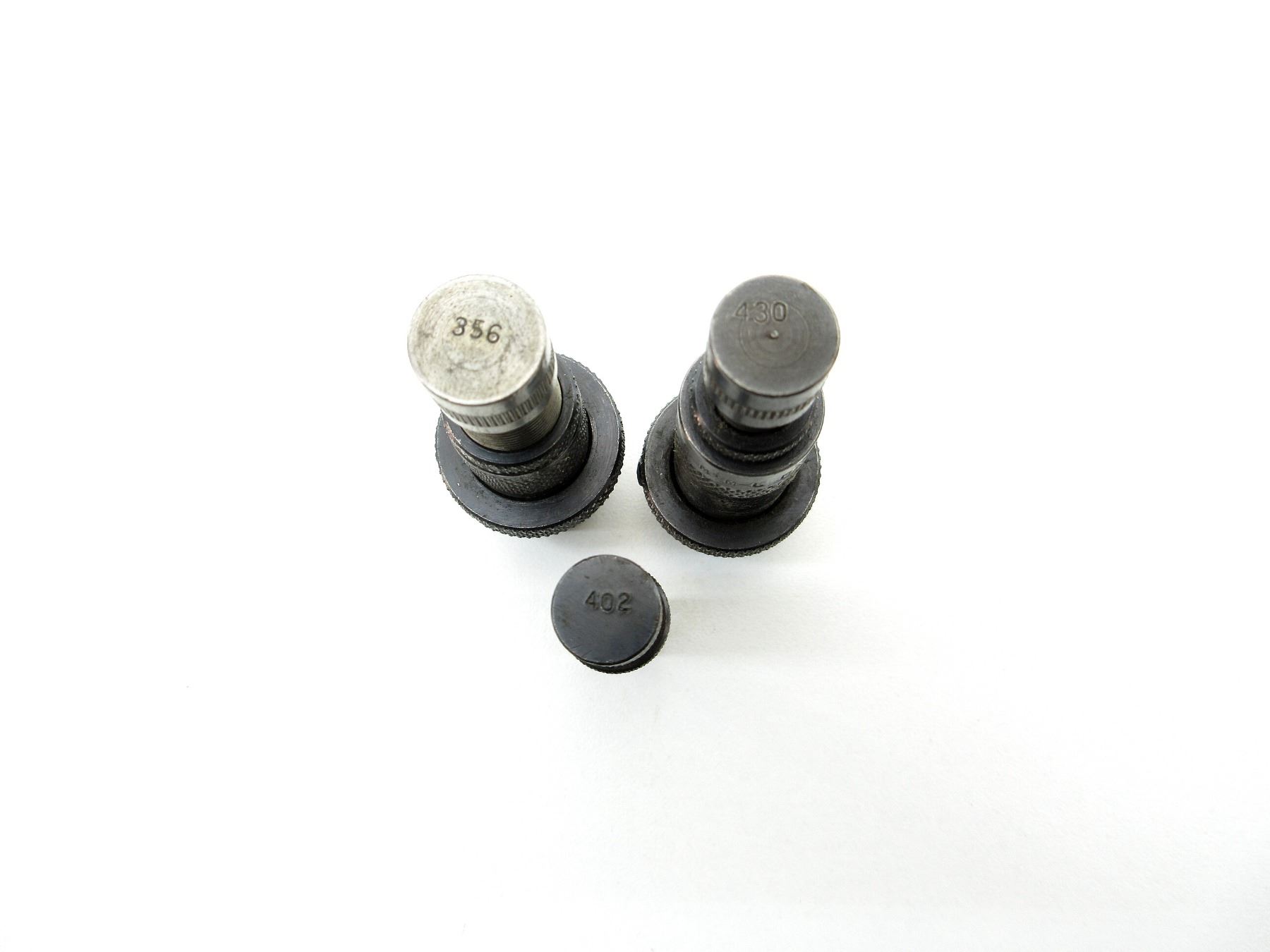 LOT INCLUDES; (3) .310 RELOADING DIES WITH (2) .310 DIE ADAPTERS 7/8 X 14 & (1) EXPANDING PLUG MARKED: "402". SEE PHOTOS.