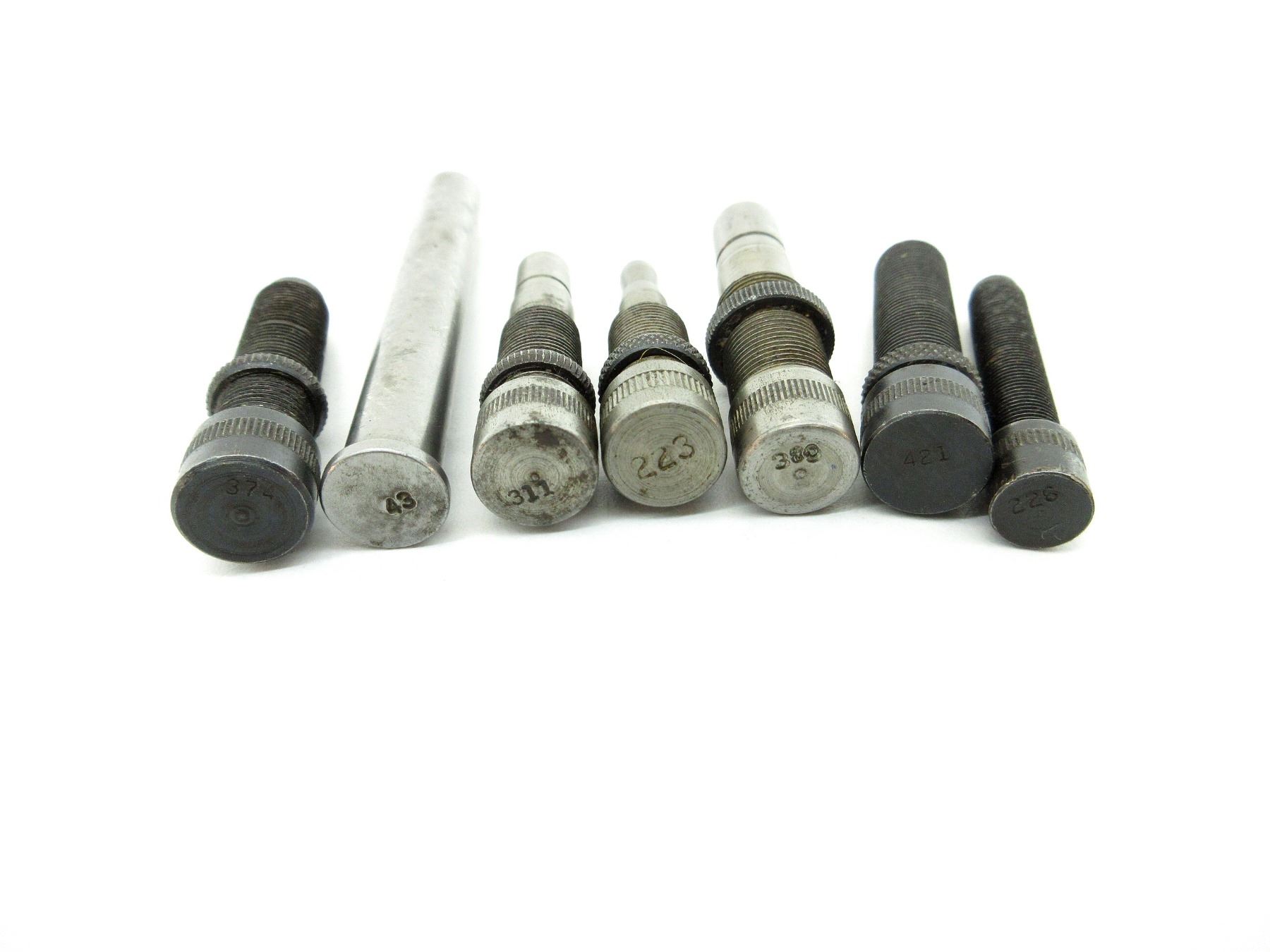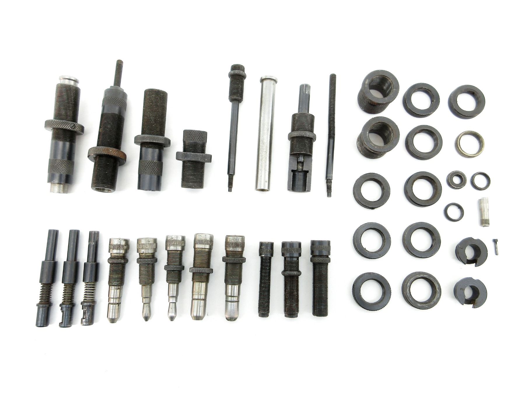 APPROX. (38) PIECES, INCLUDES; VARIOUS SIZED LOCKING RINGS, .310 DIE ADAPTERS 7/8 X 14, EXPANDING PLUGS, BULLET SEATING SCREWS, PRIMER RODS, RELOADING DIES, DECAPPING RODS, #1 SHELL HOLDER, #3 SHELL HOLDER, SOME PIECES MARKED: "95", "421", "311", "223", "358", "374", "226", "43", "389", "LYMAN 38-357 FL", "428", "348" & "1". SEE PHOTOS.