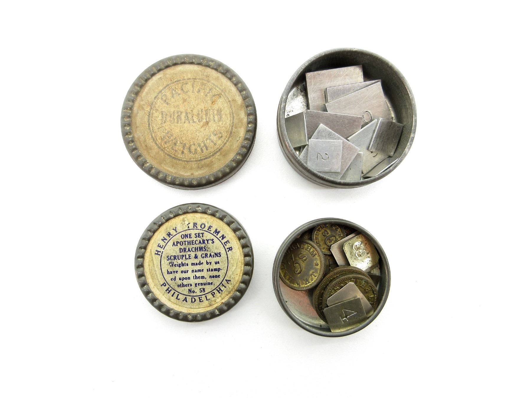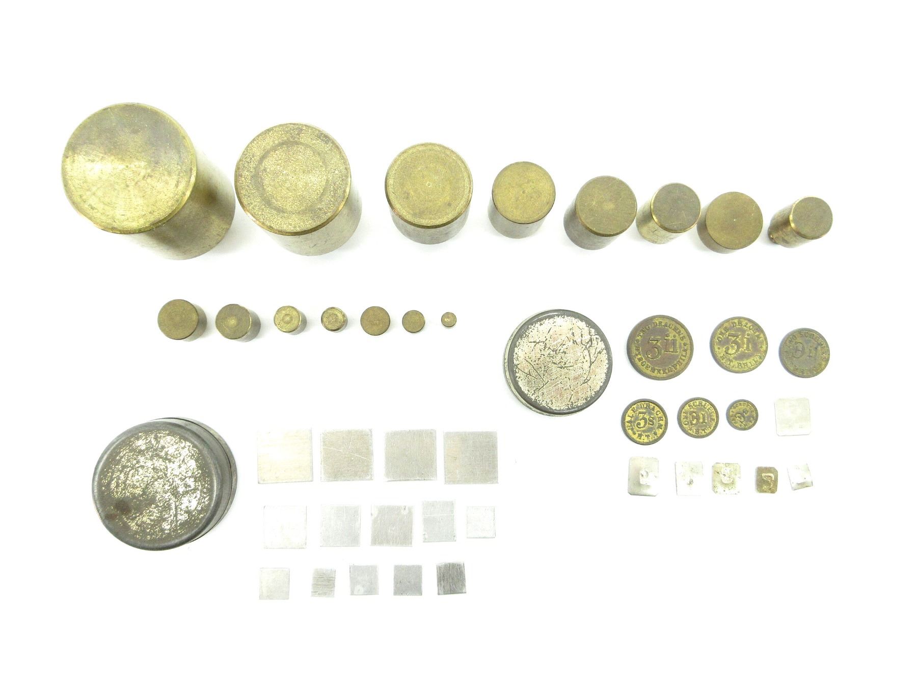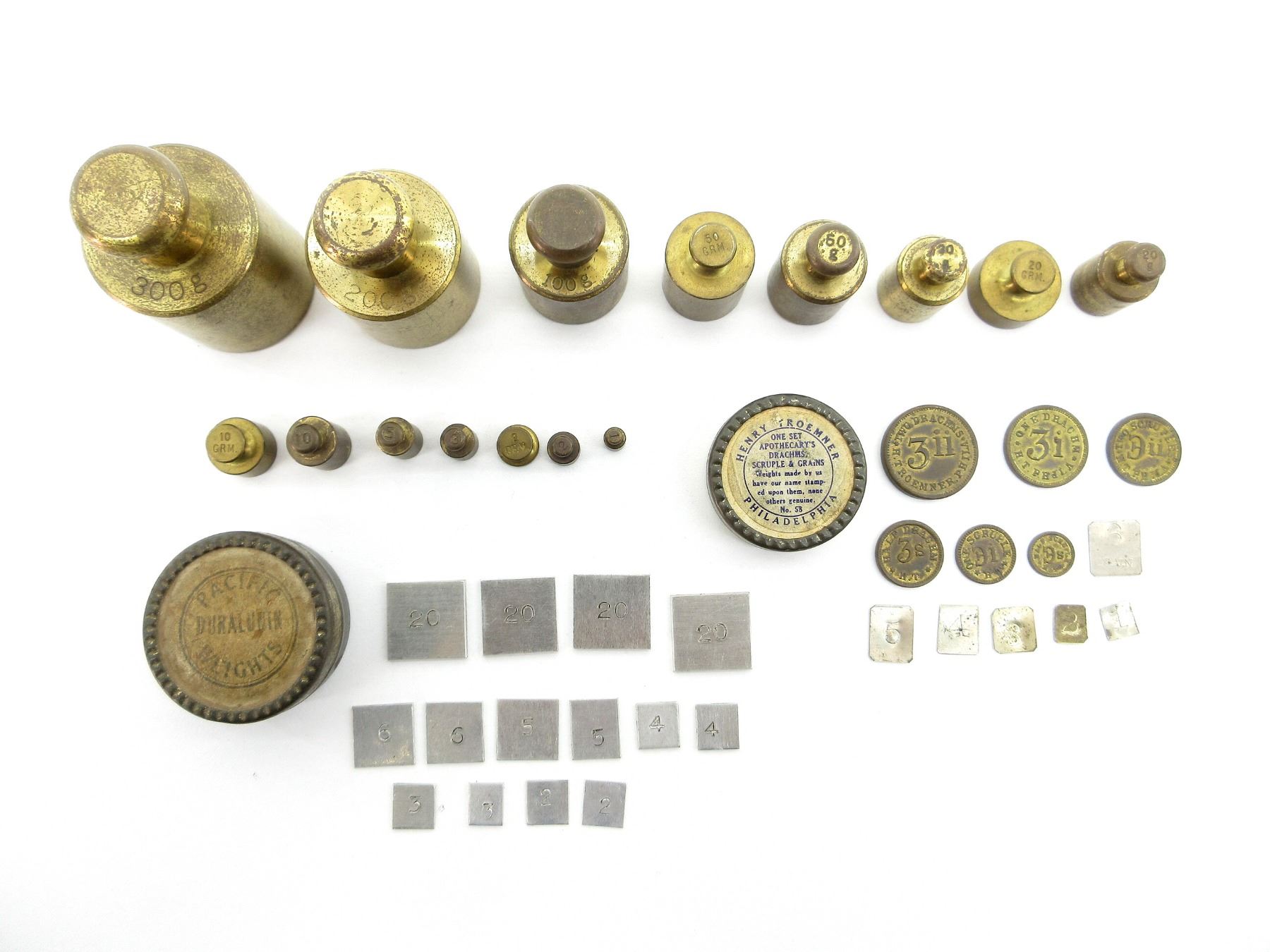 LOT INCLUDES; APPROX. (15) BRASS SCALE WEIGHTS, 1G, 2G, 3G, 5G, 10G, 20G, 30G, 50G, 100G, 200G, 300G, (1) SET OF HENRY TROEMNER APOTHECARY'S DRACHMS, SCRUPLE & GRAIN WEIGHTS, CONTAINS 1 TO 6 GRAIN WEIGHTS, HALF DRACHM WEIGHT, ONE DRACHM WEIGHT, TWO DRACHMS WEIGHT, HALF SCRUPLE WEIGHT, ONE SCRUPLE WEIGHT, TWO SCRUPLES WEIGHT & (1) SET OF PACIFIC DURALUNIN WEIGHTS, 15 WEIGHT SHEETS SIZED 1/2 TO 20. SEE PHOTOS.