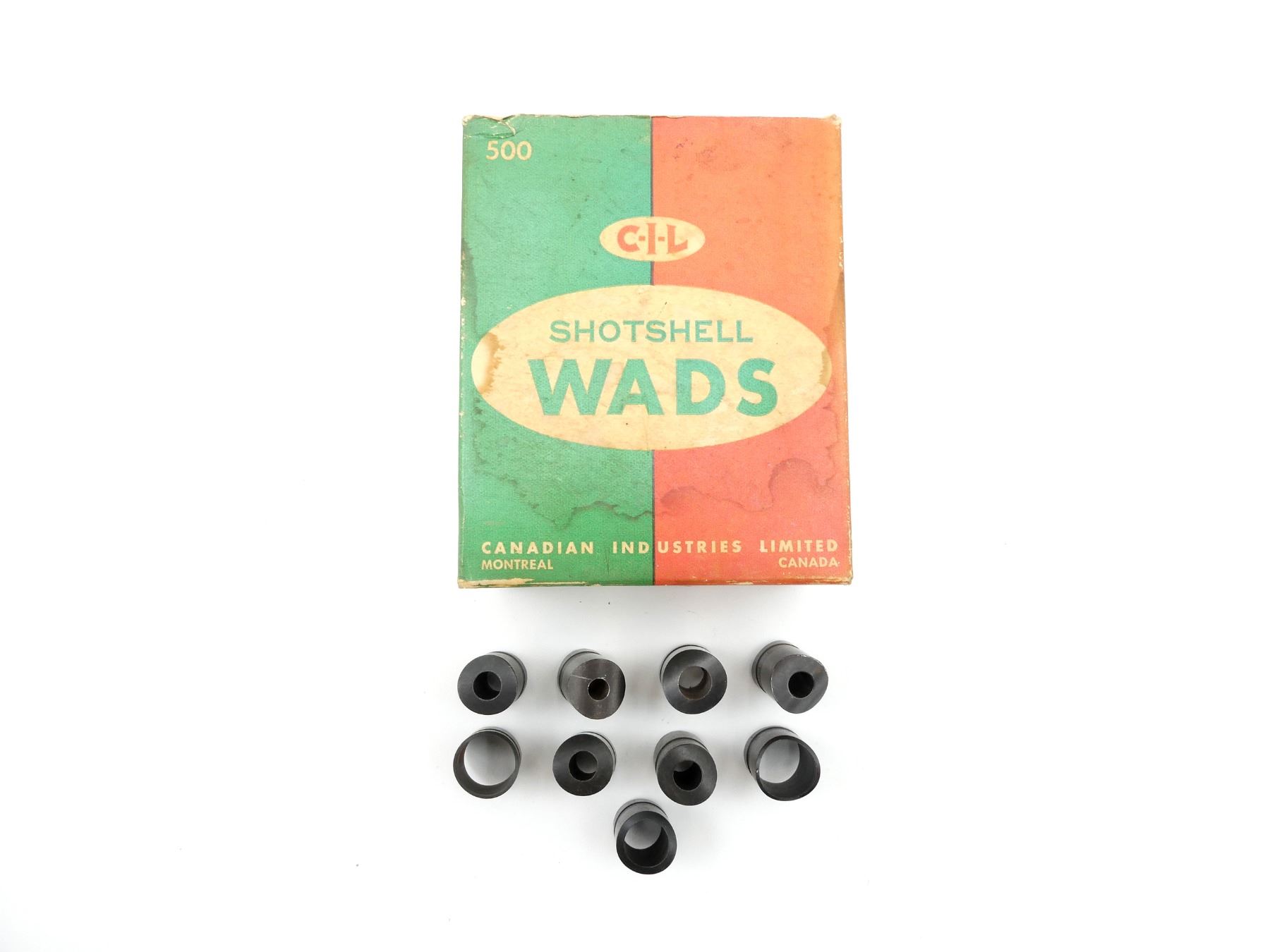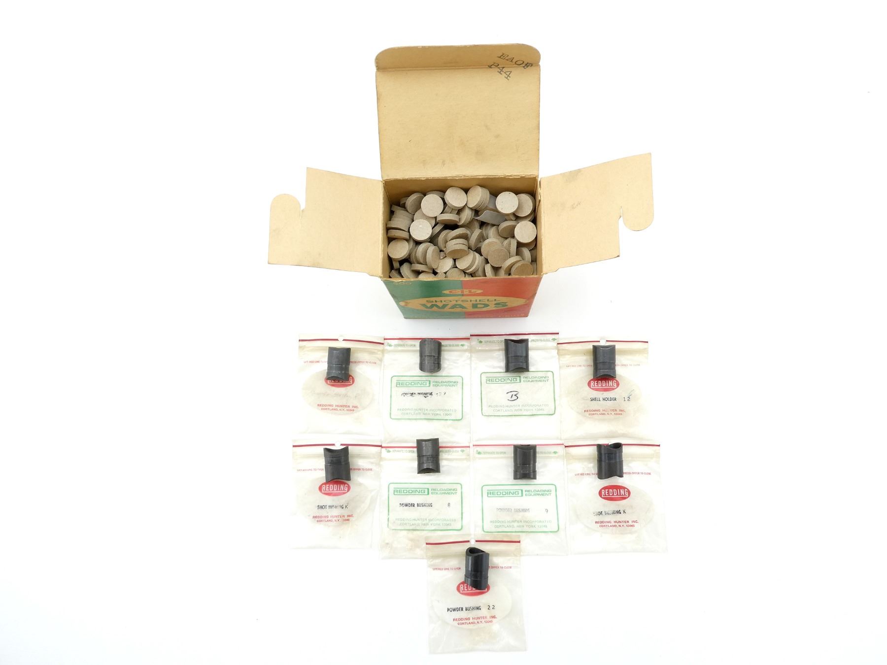 LOT INCLUDES; (9) SHOT / POWDER BUSHINGS, SIZES K, B, 6, 8, 9, 22, 27 & APPROX. (400) 20 G. CIL SHOTSHELL CARD WADS, .135" THICK, IN ORIGINAL BOX. SEE PHOTOS.