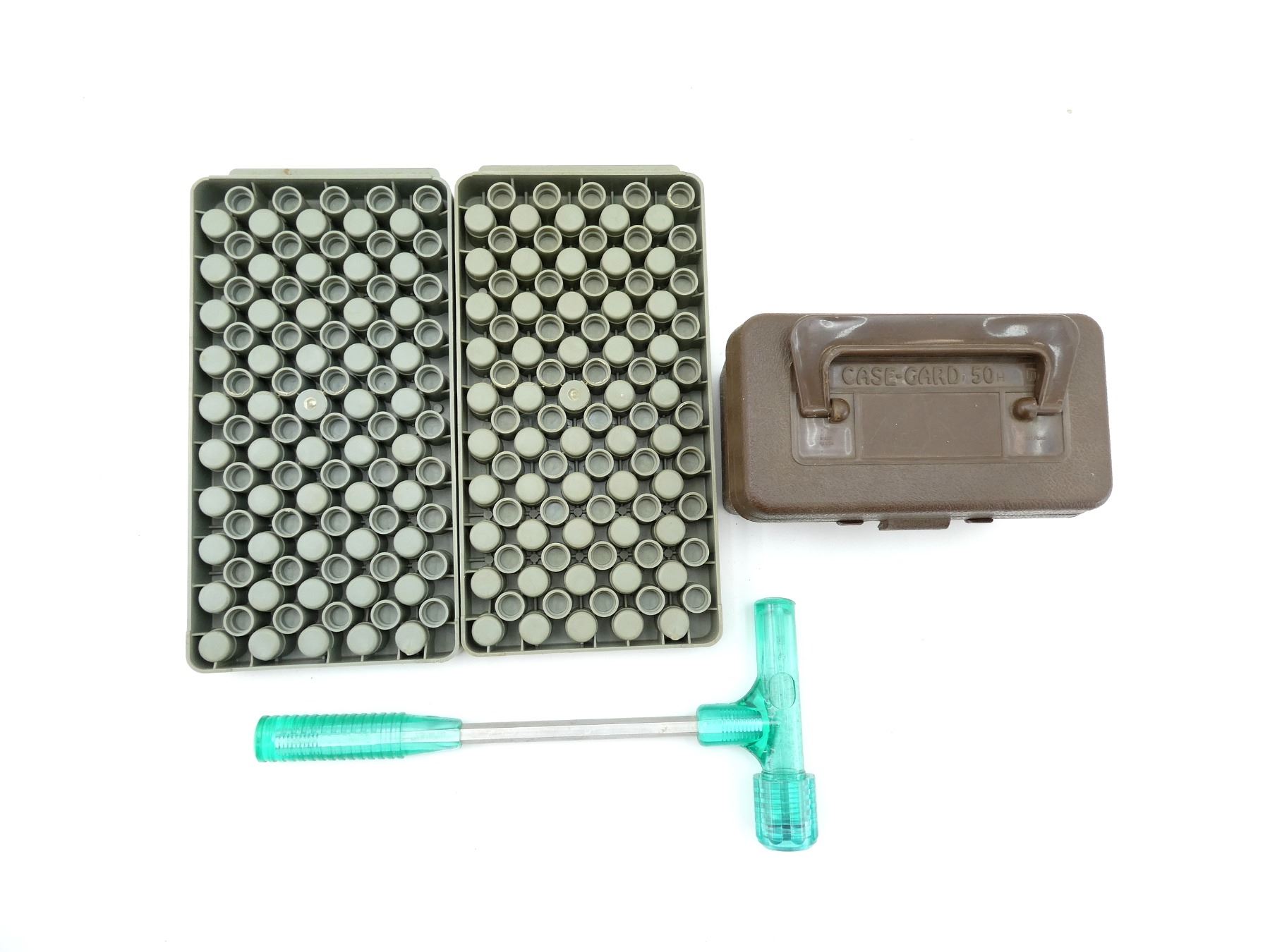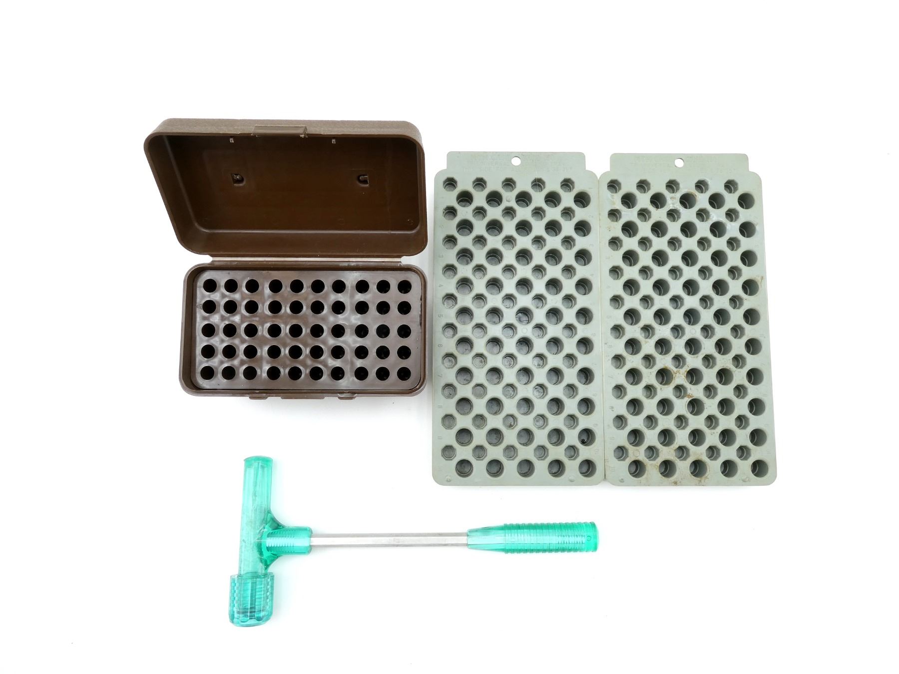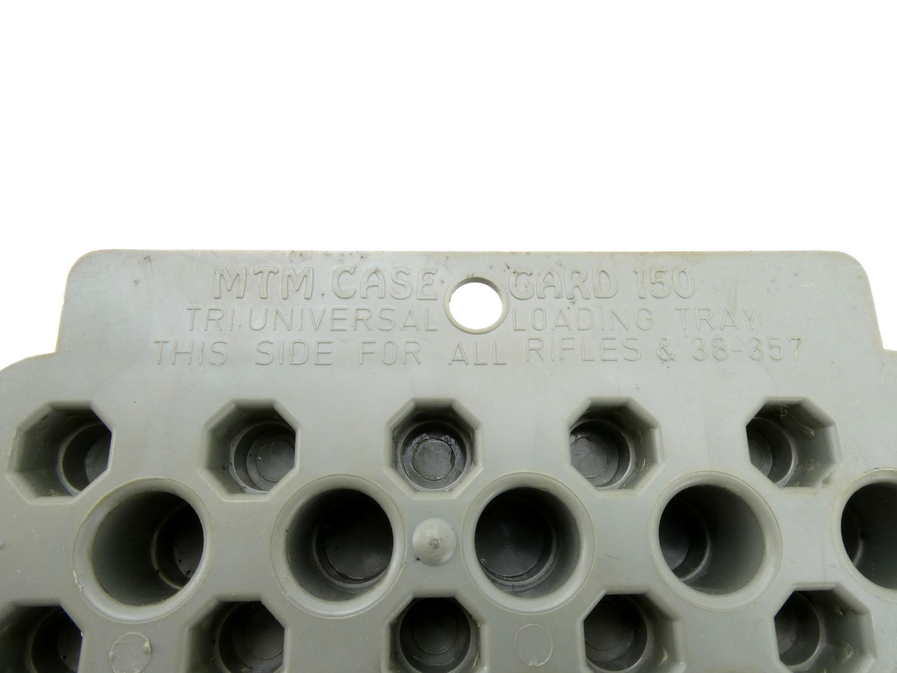 LOT INCLUDES; (2) MTM CASE GARD GREY PLASTIC 150-RND TRI-UNIVERSAL LOADING TRAYS, ONE SIDE PISTOL, ONE SIDE RIFLE, FITS VARIOUS CALIBERS, (1) MTM CASE-GARD BROWN PLASTIC 50-RND RIFLE AMMO CONTAINER, FITS VARIOUS CALIBERS & (1) RCBS KINETIC BULLET PULLER. SEE PHOTOS.