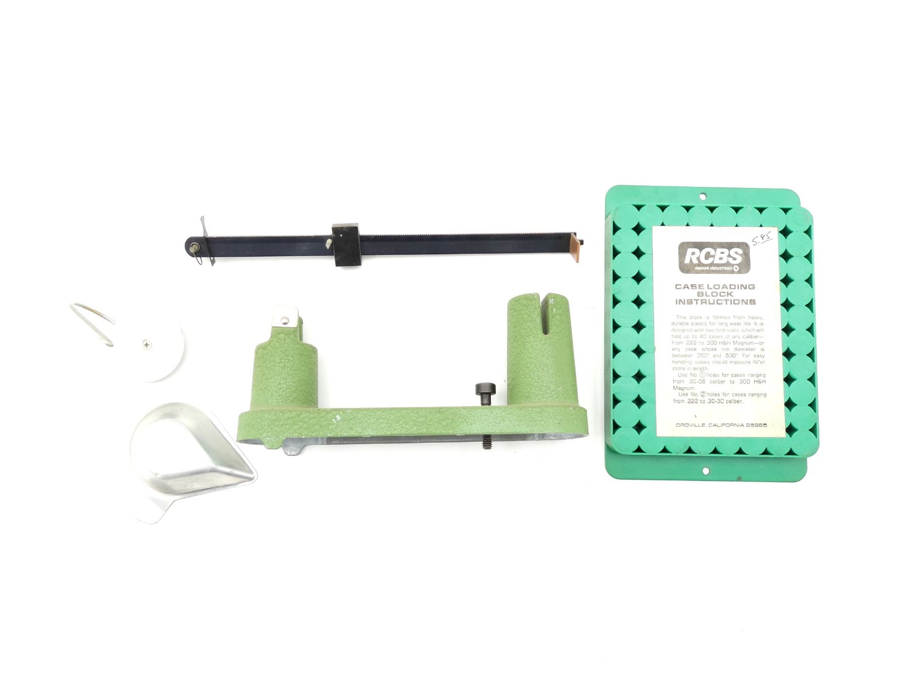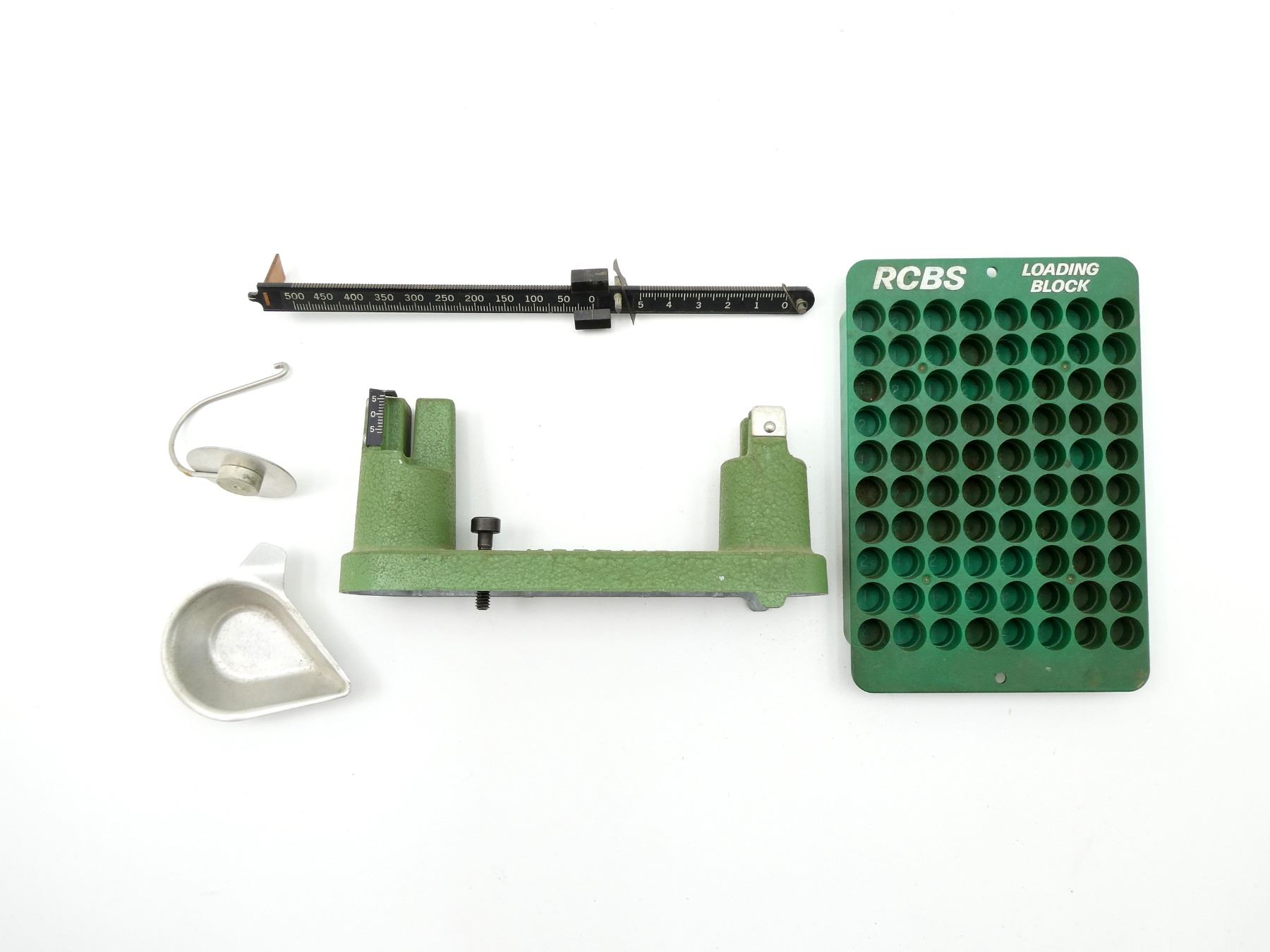 LOT INCLUDES; (1) REDDING POWDER SCALE, MAY REQUIRE ADJUSTMENTS AND/OR MAY NOT BE COMPLETE & (1) GREEN PLASTIC RCBS LOADING BLOCK, HOLDS 80-RNDS, TWO HOLE SIZES, FITS .222 TO .300 H&H MAG. SEE PHOTOS.