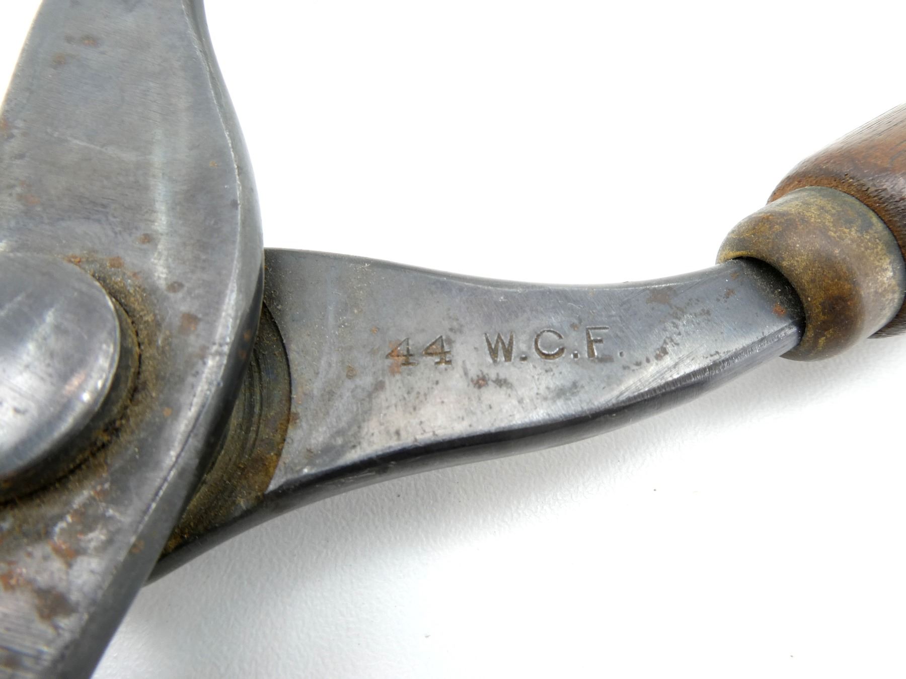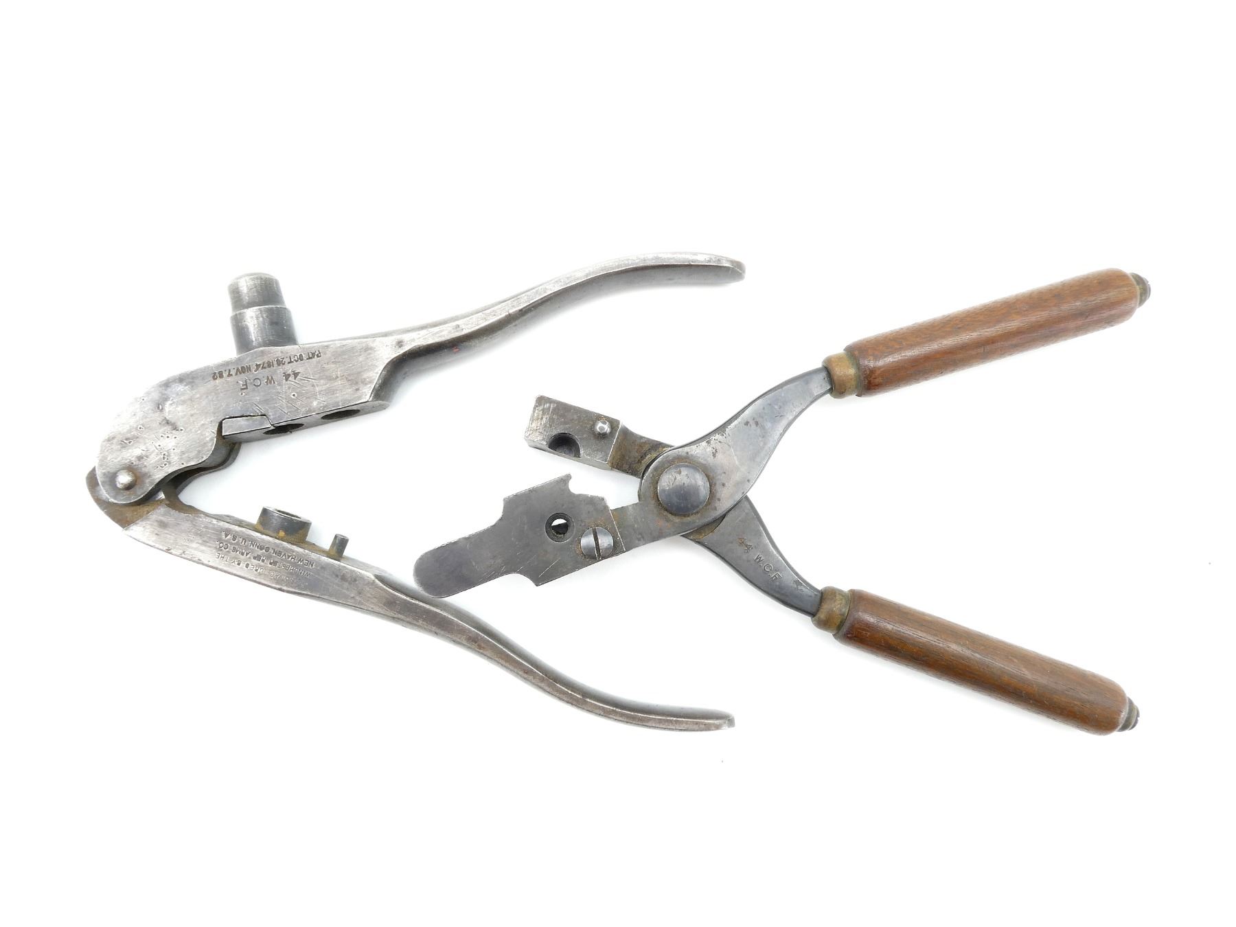 LOT INCLUDES; (1) .44 W.C.F. HAND LOADING TOOL & (1) .44 W.C.F. SINGLE-CAVITY BULLET MOLD WITH WOOD HANDLES ATTACHED. SEE PHOTOS.